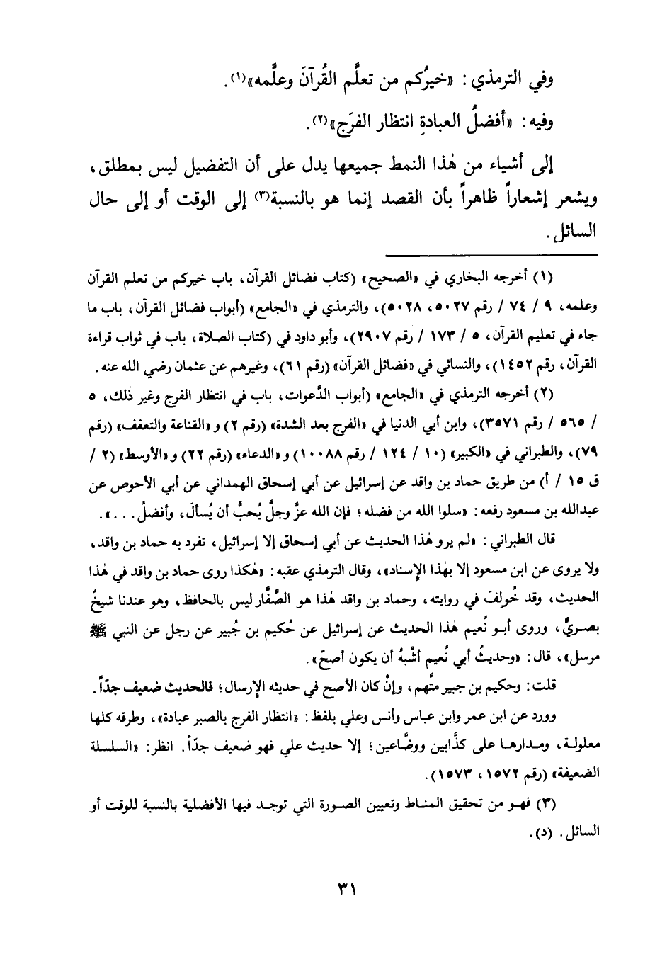 3 فهو من تحقيق المناط وتعيين الصورة التي توجد فيها الأفضلية بالنسبة للوقت أو السائل. "د".