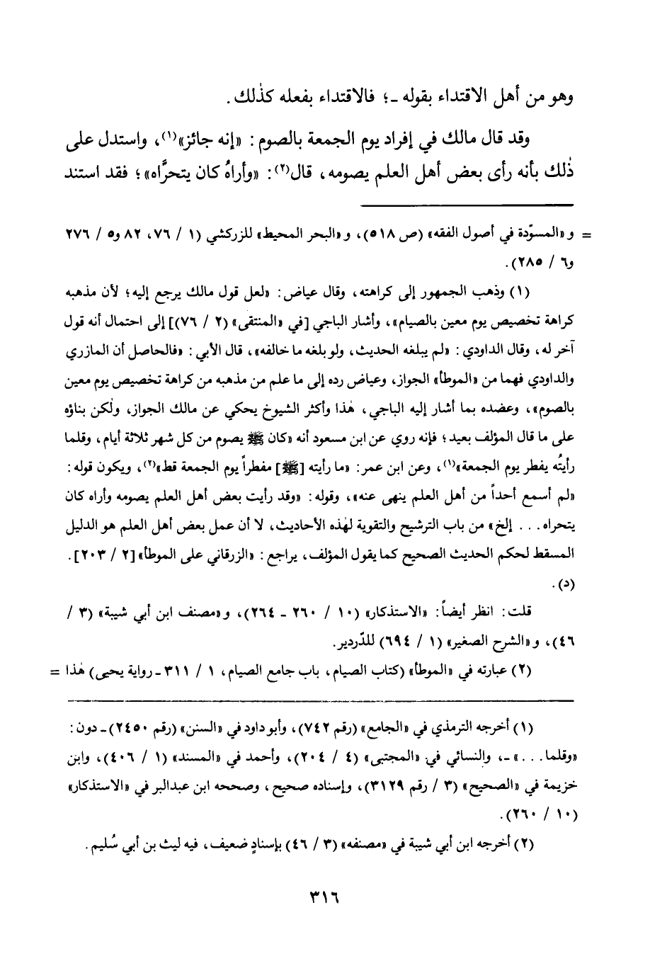 1 وذهب الجمهور إلى كراهته، وقال عياض: "لعل قول مالك يرجع إليه؛ لأن مذهبه كراهة تخصيص يوم معين بالصيام" وأشار الباجي في "المنتقى" "2/ 76" إلى احتمال أنه قول آخر له، وقال الداودي: "لم يبلغه الحديث، ولو بلغه ما خالفه"، قال الأبي: "فالحاصل أن المازري والداودي فهما من "الموطأ" الجواز، وعياض رده إلى ما علم من مذهبه من كراهته تخصيص يوم معين بالصوم، وعضده بما أشار إليه الباجي؛ هذا وأكثر الشيوخ يحكي عن مالك الجواز، ولكن بناؤه على ما قال المؤلف بعيد، فإنه روي عن ابن مسعود أنه "كان صلى الله عليه وسلم، يصوم من كل شهر ثلاثة ايام، وقلما رأيته يفطر يوم الجمعة"*، وعن ابن عمر: "ما رأيته [صلى الله عليه وسلم] مفطرًا يوم الجمعة قط"**، ويكون قوله: "لم أسمع أحدًا من أهل العلم ينهى عنه"، وقوله: "وقد رأيت بعض أهل العلم يصومه وأراه كان يتحراه ... إلخ" من باب الترشيح والتقوية لهذه الأحاديث؛ لا أن عمل بعض أهل العلم هو الدليل المسقط لحكم الحديث الصحيح كما يقول المؤلف، يراجع: "الزرقاني على الموطأ" "2/ 203". "د".