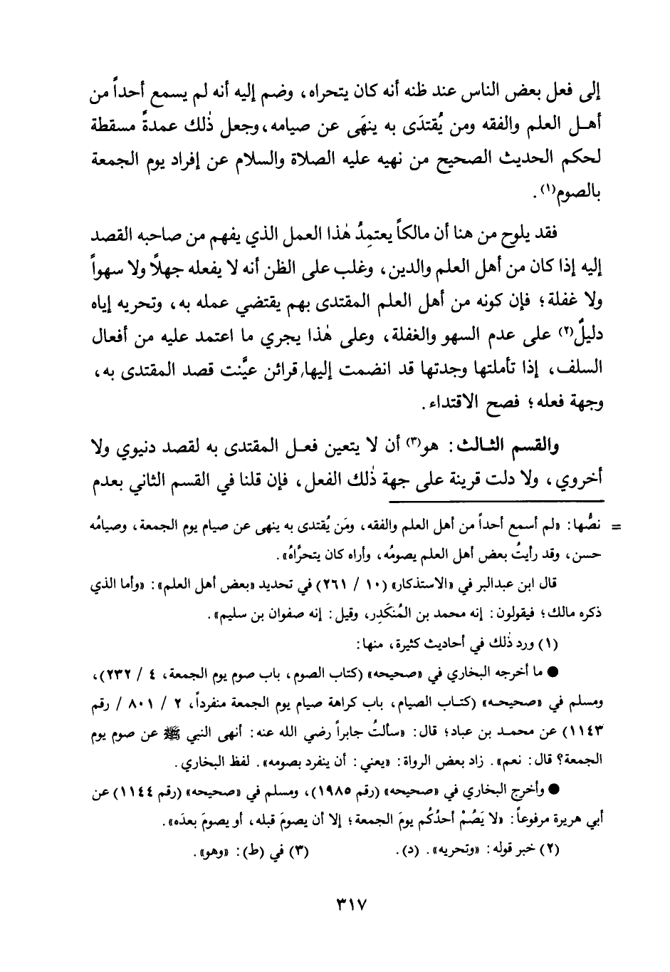 إِلَى فِعْلِ بَعْضِ النَّاسِ عِنْدَ ظَنِّهِ أَنَّهُ كَانَ يَتَحَرَّاهُ، وَضَمَّ إِلَيْهِ أَنَّهُ لَمْ يَسْمَعْ أَحَدًا مِنْ أَهْلِ الْعِلْمِ وَالْفِقْهِ وَمَنْ يُقْتَدَى بِهِ يَنْهَى عَنْ صِيَامِهِ، وَجَعَلَ ذَلِكَ عُمْدَةً مُسْقِطَةً لِحُكْمِ الْحَدِيثِ الصَّحِيحِ مِنْ نَهْيِهِ عَلَيْهِ الصَّلَاةُ وَالسَّلَامُ عَنْ إِفْرَادِ يَوْمِ الْجُمُعَةِ بِالصَّوْمِ.