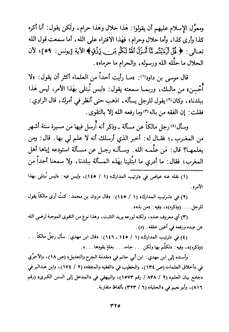 4 في "ترتيب المدراك" "1/ 145-146": "قال ابن مهدي: سأل رجل مالكًا" ... و"ذكره"، وفيه: "تكلم بها ولكن ... جاءه.... بغلة يقودها ... ".