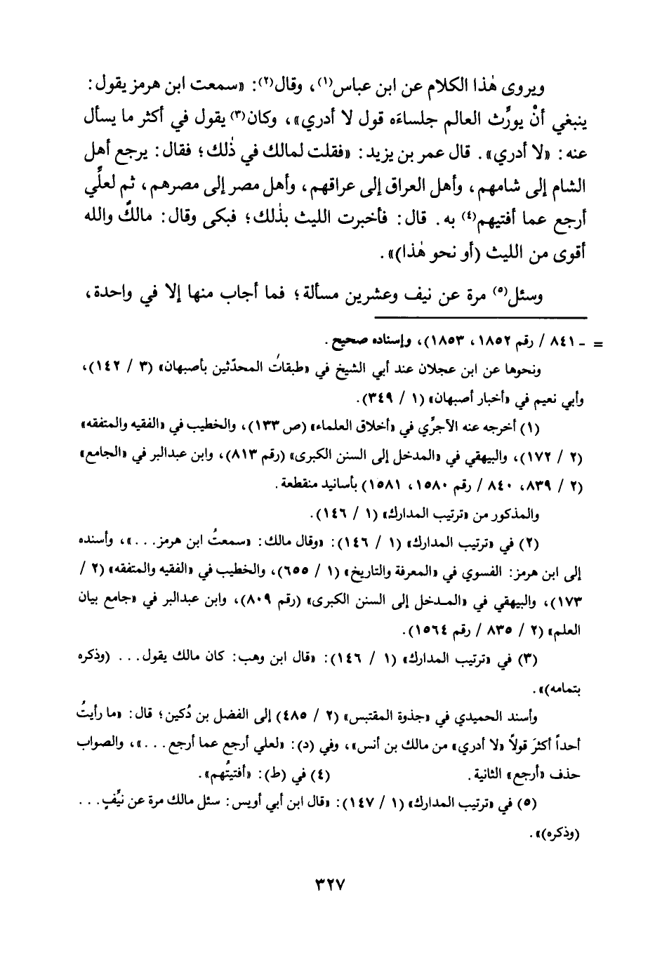 وَيُرْوَى هَذَا الْكَلَامُ عَنِ ابْنِ عَبَّاسٍ1، وَقَالَ2: "سَمِعْتُ ابْنَ هُرْمُزَ يَقُولُ: يَنْبَغِي أَنْ يُوَرِّثَ الْعَالِمُ جُلَسَاءَهُ قَوْلَ لَا أَدْرِي"، وَكَانَ3 يَقُولُ فِي أَكْثَرِ مَا يُسْأَلُ عَنْهُ: "لَا أَدْرِي". قَالَ عُمَرُ بْنُ يَزِيدَ: "فَقُلْتُ لِمَالِكٍ فِي ذَلِكَ؛ فَقَالَ: يَرْجِعُ أَهْلُ الشَّامِ إِلَى شَامِهِمْ، وَأَهْلُ الْعِرَاقِ إِلَى عِرَاقِهِمْ، وَأَهْلُ مِصْرَ إِلَى مصرهم، ثم لعلي أرجع عما أُفْتِيهِمْ4 بِهِ. قَالَ: فَأَخْبَرْتُ اللَّيْثَ بِذَلِكَ؛ فَبَكَى وَقَالَ: مَالِكٌ وَاللَّهِ أَقْوَى مِنَ اللَّيْثِ "أَوْ نَحْوُ هَذَا".