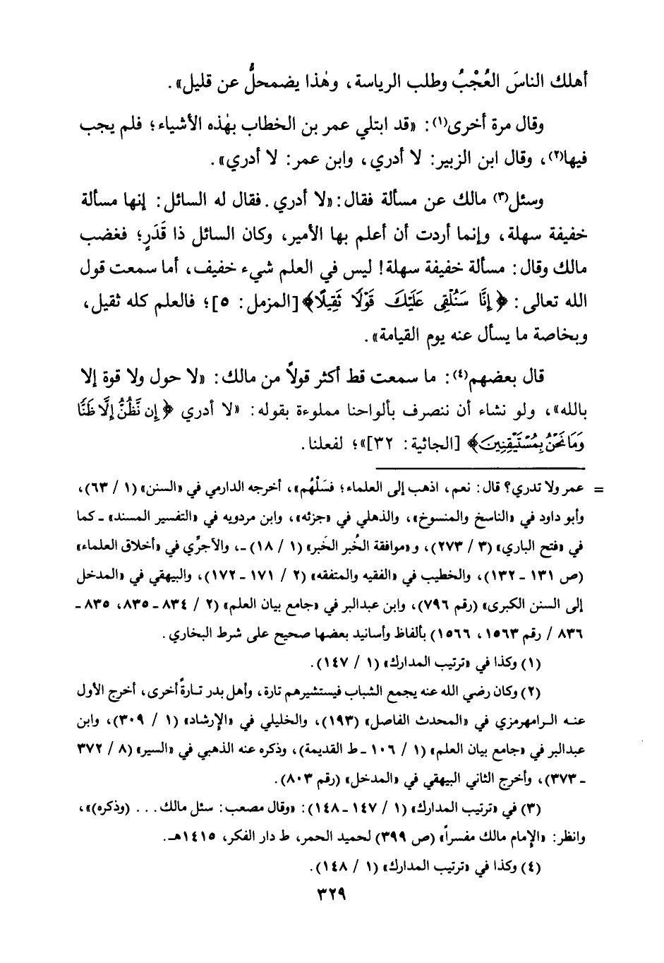 وَسُئِلَ3 مَالِكٌ عَنْ مَسْأَلَةٍ فَقَالَ: "لَا أَدْرِي. فَقَالَ لَهُ السَّائِلُ: إِنَّهَا مَسْأَلَةٌ خَفِيفَةٌ سَهْلَةٌ، وَإِنَّمَا أَرَدْتُ أَنْ أُعْلِمَ بِهَا الْأَمِيرَ، وَكَانَ السَّائِلُ ذَا قَدر؛ فَغَضِبَ مَالِكٌ وَقَالَ: مَسْأَلَةٌ خَفِيفَةٌ سَهْلَةٌ! لَيْسَ فِي الْعِلْمِ شَيْءٌ خَفِيفٌ، أَمَا سَمِعْتَ قَوْلَ اللَّهِ تَعَالَى: {إِنَّا سَنُلْقِي عَلَيْكَ قَوْلًا ثَقِيلًا} [الْمُزَّمِّلِ: 5] ؛ فَالْعِلْمُ كُلُّهُ ثَقِيلٌ، وَبِخَاصَّةٍ مَا يُسْأَلُ عَنْهُ يَوْمَ الْقِيَامَةِ".