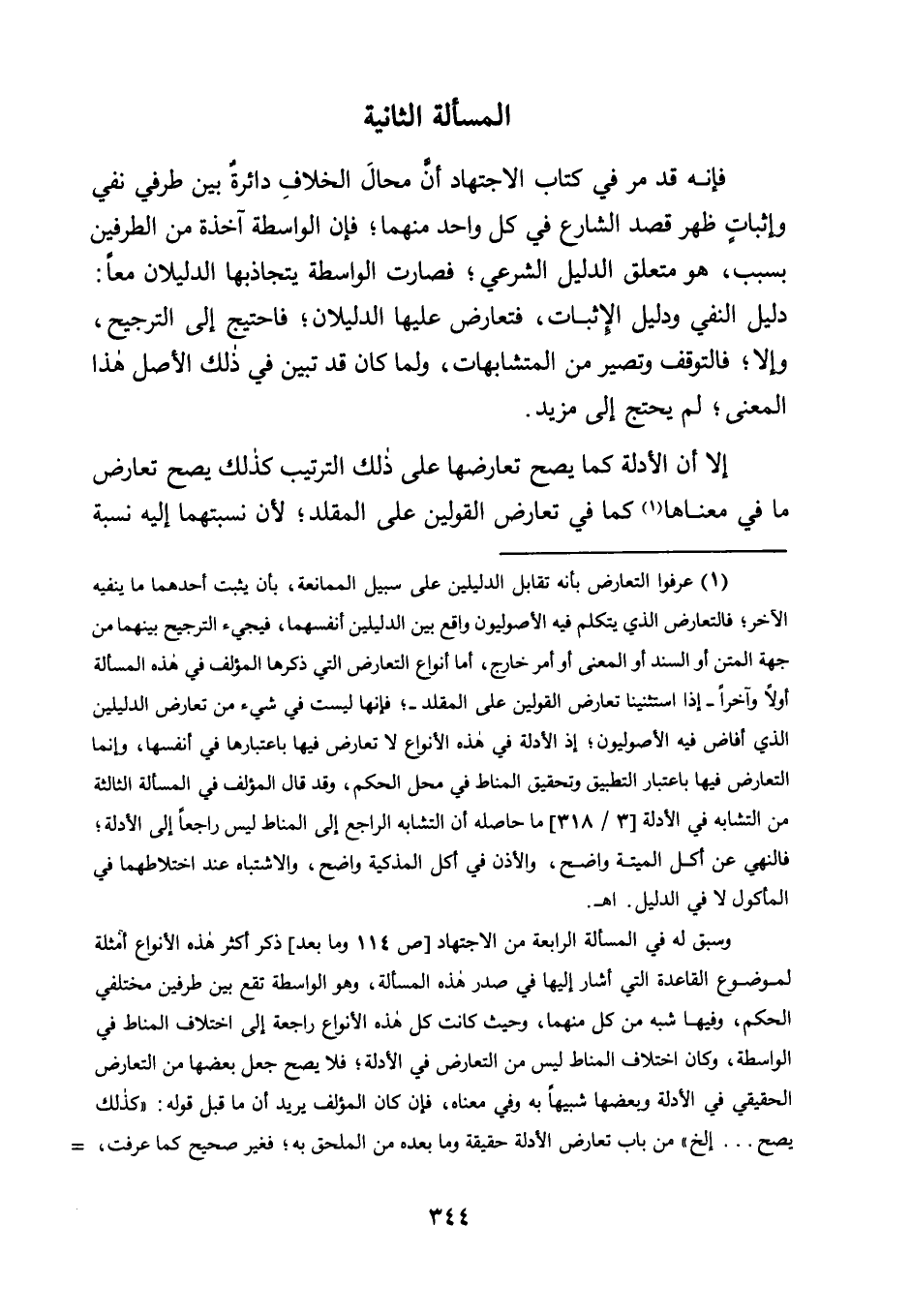 1 عرفوا التعارض بأنه تقابل الدليلين على سبيل الممانعة، بأن يثبت أحدهما ما ينفيه الأخر؛ فالتعارض الذي يتكلم فيه الأصولين واقع بين الدليلين أنفسهما، فيجيء الترجيح بينهما من جهة المتن أو السند أو المعنى أو أمر خارج؛ أما أنواع التعارض التي ذكرها المؤلف من هذه المسألة أولًا وآخرًا -إذا استثنينا تعارض القولين على المقلد- فأنها ليست في شيء من تعارض الدليلين الذي أفاض فيه الأصوليون؛ إذ الأدلة في هذه الأنواع لا تعارض فيها باعتبارها في أنفسها، وإنما التعارض فيها باعتبار التطبيق وتحقيق المناط في محل الحكم، وقد قال المؤلف في المسألة الثالثة من التشابه في الأدلة "3/ 318" ما حصله أن التشابه الراجح إلى المناط ليس راجعًا إلى الأدلة؛ فالنهي عن أكل الميتة واضح، والإذن في أكل المذكية واضح، والاشتباه عند اختلاطهما في المأكول لا في الدليل. ا. هـ.