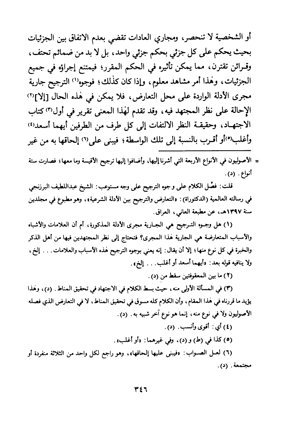 = الأصوليون في الأنواع الأربعة التي أشرنا إليها، وأضافوا إليها ترجيح الأقيسة وما معها؛ فصارت ستة أنواع. "د".