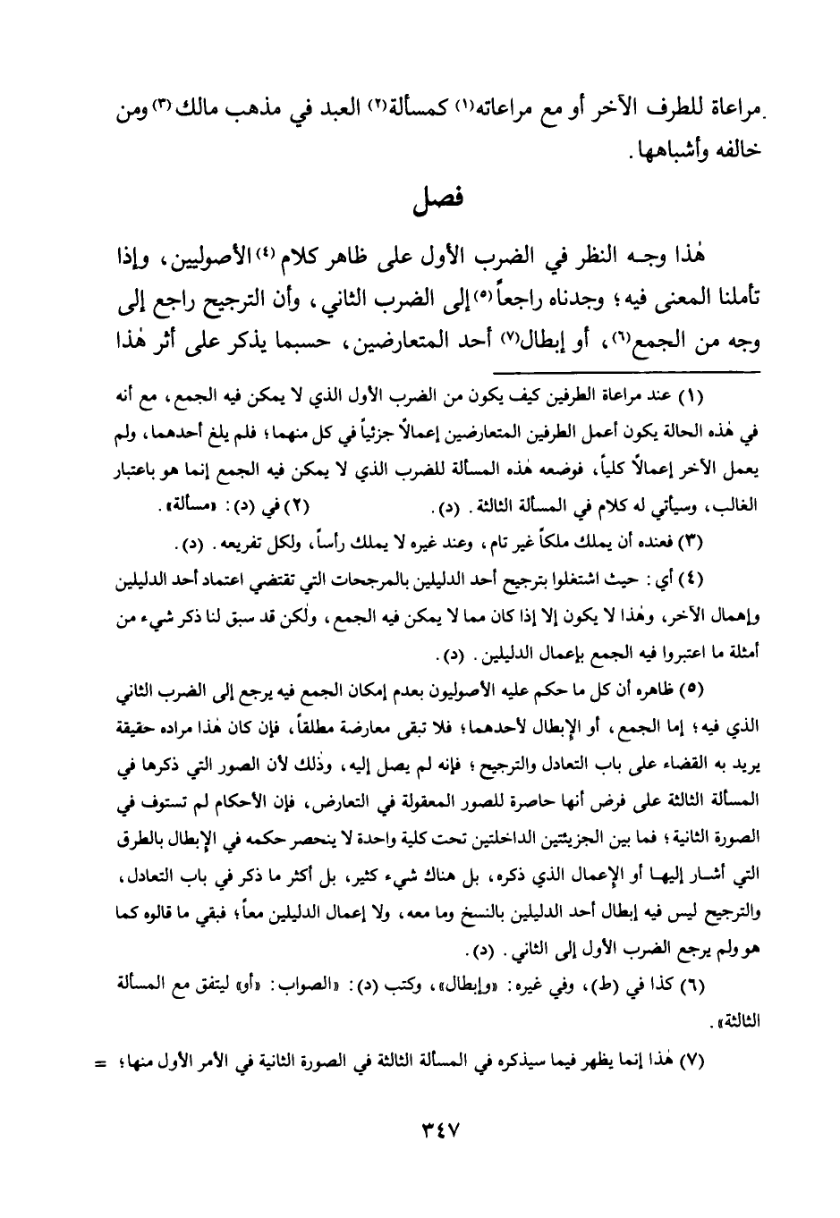 5 ظاهره أن كل ما حكم عليه الأصوليون بعدم إمكان الجمع فيه يرجع إلى الضرب الثاني الذي فيه؛ إما الجمع، أو الأبطال لأحدهما؛ فلا تبقى معارضة مطلقًا، فإن كان هذا مراده حقيقة يريد به القضاء على باب التعادل والترجيح؛ فإنه لم يصل إليه، وذلك لأن الصور التي ذكرها في المسألة الثالثة على فرض أنها حاصرة للصور المعقولة في التعارض، فإن الأحكام لم تُستوفَ في الصورة الثانية؛ فما بين الجزئيتين الداخلتين تحت كلية واحدة لا ينحصر حكمه في الإبطال بالطرق التي أشار إليها أو الإعمال الذي ذكره، بل هناك شيء كثير، بل أكثر ما ذكر في باب التعادل، والترجيح ليس فيه إبطال أحد الدليلين بالنسخ وما معه، ولا إعمال الدليلين معًا؛ فبقي ما قالوه كما هو ولم يرجع الضرب الأول إلى الثاني. "د".