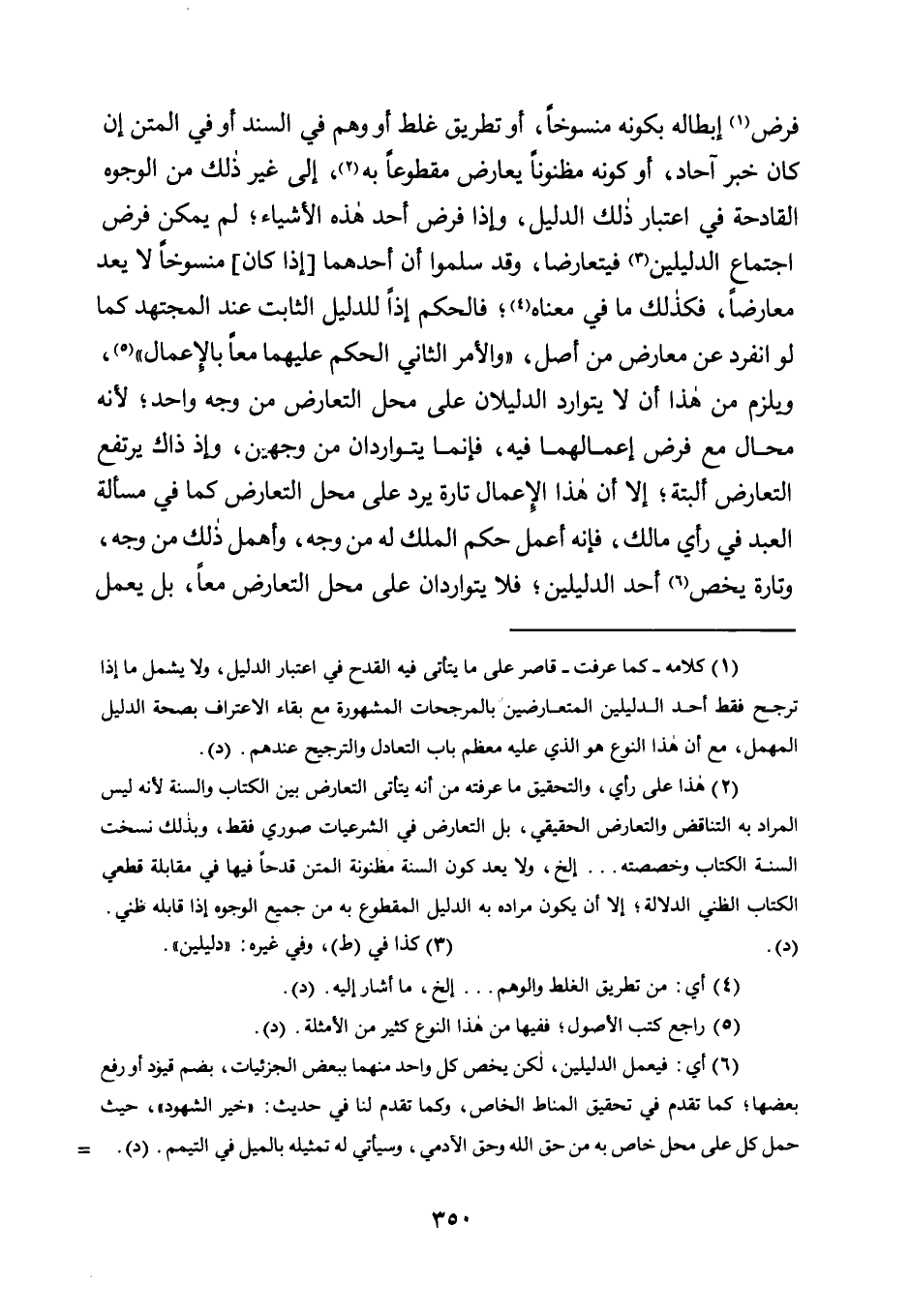 1 كلامه -كما عرفت- قاصر على ما يتأتى فيه القدح في اعتبار الدليل، ولا يشمل ما إذا ترجح فقط أحد الدليلين المتعارضين بالمرجحات المشهورة مع بقاء الاعتراف بصحة الدليل المهمل، مع أن هذا النوع هو الذي عليه معظم باب التعادل والترجيح عندهم. "د".