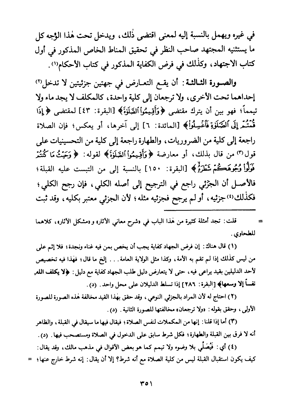 وَالصُّورَةُ الثَّالِثَةُ: أَنْ يَقَعَ التَّعَارُضُ فِي جِهَتَيْنِ جُزْئِيَّتَيْنِ لَا تَدْخُلُ2 إِحْدَاهُمَا تَحْتَ الْأُخْرَى، وَلَا تَرْجِعَانِ إِلَى كُلِّيَّةٍ وَاحِدَةٍ، كَالْمُكَلَّفِ لَا يَجِدُ مَاءً وَلَا تَيَمُّمًا؛ فَهُوَ بَيْنَ أَنْ يَتْرُكَ مقتضى {أَقِيمُوا الصَّلاة} [الْبَقَرَةِ: 43] لِمُقْتَضَى {إِذَا قُمْتُمْ إِلَى الصَّلاةِ فَاغْسِلُوا} [الْمَائِدَةِ: 6] إِلَى آخِرِهَا، أَوْ يَعْكِسُ؛ فَإِنَّ الصَّلَاةَ رَاجِعَةٌ إِلَى كُلِّيَّةٍ مِنَ الضَّرُورِيَّاتِ، وَالطَّهَارَةَ رَاجِعَةٌ إِلَى كُلِّيَّةٍ مِنَ التَّحْسِينِيَّاتِ عَلَى قَوْلِ3 من قال بذلك، أو معارضة {أَقِيمُوا الصَّلَاةَ} لقوله: {وَحَيْثُ مَا كُنْتُمْ فَوَلُّوا وُجُوهَكُمْ شَطْرَهُ} [الْبَقَرَةِ: 150] بِالنِّسْبَةِ إِلَى مَنِ الْتَبَسَتْ عَلَيْهِ الْقِبْلَةُ؛ فَالْأَصْلُ أَنَّ الْجُزْئِيَّ رَاجِعٌ فِي التَّرْجِيحِ إِلَى أَصْلِهِ الْكُلِّيِّ، فَإِنْ رَجَحَ الْكُلِّيُّ؛ فَكَذَلِكَ4 جُزْئِيُّهُ، أَوْ لَمْ يَرْجَحْ فَجُزْئِيُّهُ مِثْلُهُ؛ لِأَنَّ الْجُزْئِيَّ مُعْتَبَرٌ بِكُلِّيِّهِ، وَقَدْ ثبت