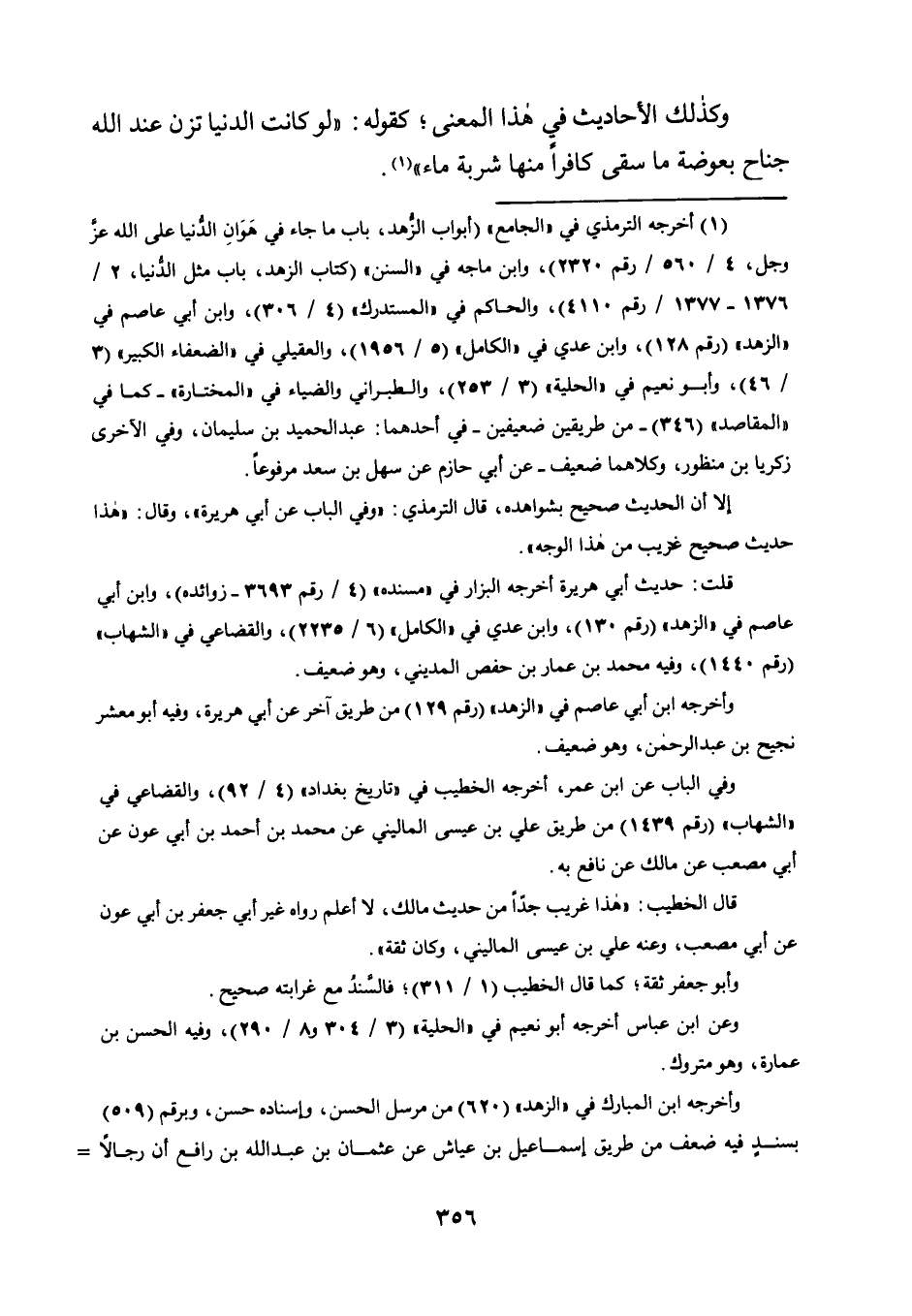 وَكَذَلِكَ الْأَحَادِيثُ فِي هَذَا الْمَعْنَى؛ كَقَوْلِهِ: "لَوْ كَانَتِ الدُّنْيَا تَزِنُ عِنْدَ اللَّهِ جَنَاحَ بَعُوضَةٍ ما سقى كافرًا منها شربة ماء" 1.