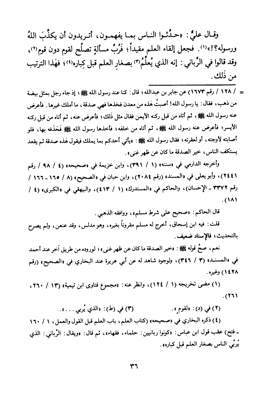 = / 128/ رقم 1673 عن جابر بن عبد الله، قال: كنا عِنْدِ رَسُولِ اللَّهِ صَلَّى اللَّهُ عَلَيْهِ وَسَلَّمَ، إِذْ جاء رجل بمثل بيضة من ذهب، فقال: يا رسول الله! أصبت هذه من معدن فخذها فهي صدقة، ما أملك غيرها، فأعرض عنه رسول الله صلى الله عليه وسلم، ثم أتاه من قبل ركنه الأيمن فقال مثل ذلك، فأعرض عنه، ثم أتاه من قبل ركنه الأيسر، فأعرض عنه رسول الله صلى الله عليه وسلم، ثم أتاه من خلفه، فأخذها رسول الله صلى الله عليه وسلم فحذفه بها، فلو أصابته لأوجعته، أو لعقرته، فقال رسول الله صلى الله عليه وسلم: "يأتي أحدكم بما يملك، فيقول: هذه صدقة ثم يقعد يستكف الناس، خير الصدقة ما كان عن ظهر غنى".