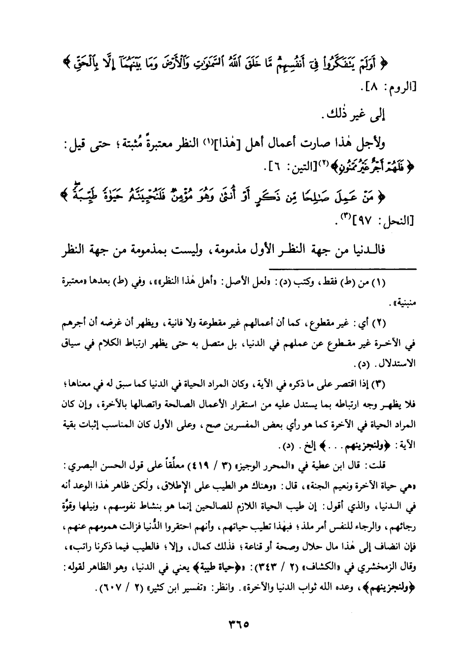 3 إذا اقتصر على ما ذكره في الآية، وكان المراد الحياة في الدنيا كما سبق له في معناها؛ فلا يظهر وجه ارتباطه بما يستدل عليه من استقرار الأعمال الصالحة واتصالها بالآخرة، وإن كان المراد الحياة في الآخرة كما هو رأي بعض المفسرين صح؛ وعلى الأول كان المناسب إثبات بقية الآية: {وَلَنَجْزِيَنَّهُمْ} إلخ. "د".