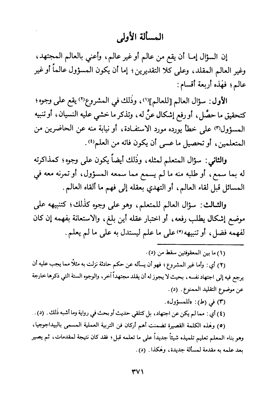 إِنَّ السُّؤَالَ إِمَّا أَنْ يَقَعَ مِنْ عَالِمٍ أَوْ غَيْرِ عَالِمٍ، وَأَعْنِي بِالْعَالِمِ الْمُجْتَهِدِ، وَغَيْرِ الْعَالِمِ الْمُقَلِّدِ، وَعَلَى كِلَا التَّقْدِيرَيْنِ؛ إِمَّا أَنْ يَكُونَ الْمَسْئُولُ عَالِمًا أَوْ غَيْرَ عَالِمٍ؛ فَهَذِهِ أَرْبَعَةُ أَقْسَامٍ: