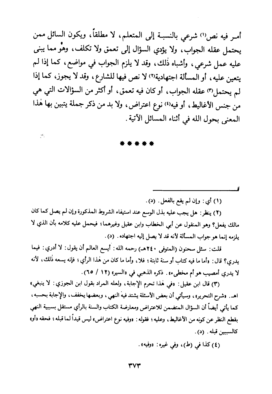 3 قال ابن عقيل: "في هذا تحرم الإجابة، ولعله المراد بقول ابن الجوزي: لا ينبغي" ا. هـ. "شرح التحرير"، وسيأتي أن بعض الأسئلة يشتد فيه النهي، وبعضها يخفف، والإجابة بحسبه، كما يأتي أيضًا أن السؤال المتضمن للاعتراض ومعارضة الكتاب والسنة بالرأي مستقل بسببية النهي بقطع النظر عن كونه من الأغاليط، وعليه؛ فقوله: "وفيه نوع اعتراض" ليس قيدًا لما قبله؛ فحقه "أو" كالسببين قبله. "د".