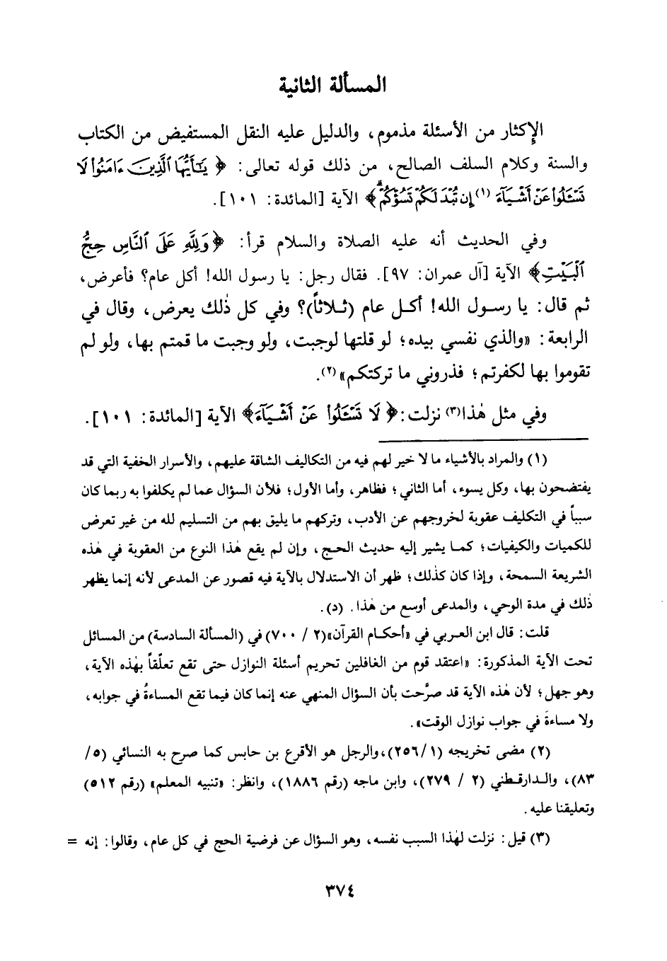 الْإِكْثَارُ مِنَ الْأَسْئِلَةِ مَذْمُومٌ، وَالدَّلِيلُ عَلَيْهِ النَّقْلُ الْمُسْتَفِيضُ مِنَ الْكِتَابِ وَالسُّنَّةِ وَكَلَامِ السَّلَفِ الصَّالِحِ؛ مِنْ ذَلِكَ قَوْلُهُ تَعَالَى: {يَا أيها يَا أَيُّهَا الَّذِينَ آمَنُوا لَا تَسْأَلوا عَنْ أَشْيَاءَ 1 إِنْ تُبْدَ لَكُمْ تَسُؤْكُمْ} الْآيَةَ: [الْمَائِدَةِ: 101] .