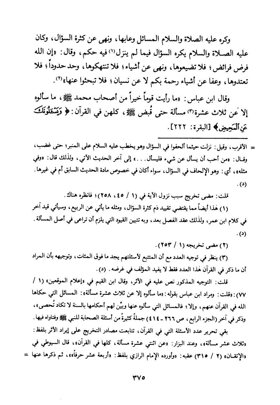 قلت: التوجيه المذكور نص عليه في الأثر، وقال ابن القيم في "إعلام الموقعين" "1/ 77": "قلت: ومراد ابن عباس بقوله: "ما سألوه إلا عن ثلاث عشرة مسألة": المسائل التي حكاها الله في القرآن عنهم: وإلا؛ فالمسائل التي سألوه عنها وبين لهم أحكامها بالسنة لا تكاد تحصى"، وذكر في آخر "الجزء الرابع، ص266-414"، جملة كثيرة من أسئلة الصحابة للنبي صلى الله عليه وسلم وفتاواه فيها.
