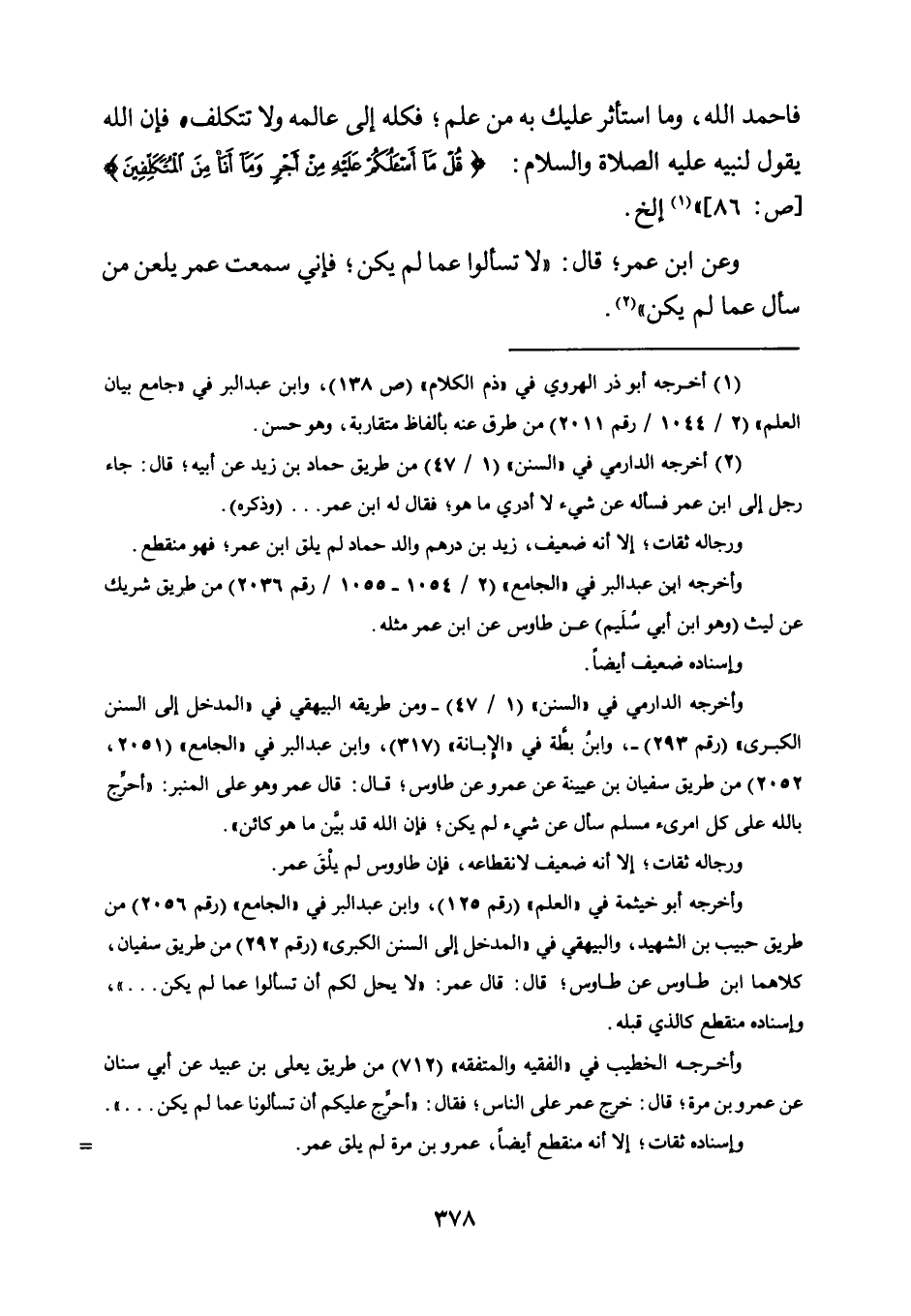 وأخرجه أبو خيثمة في "العلم" "رقم 125"، وابن عبد البر في "الجامع" "رقم 2056" من طريق حبيب بن الشهيد، والبيهقي في "المدخل إلى السنن الكبرى" "رقم 292" من طريق سفيان، كلاهما: ابن طاوس عن طاوس؛ قال: قال عمر: "لا يحل أن تسألوا عما لم يكن ... ".