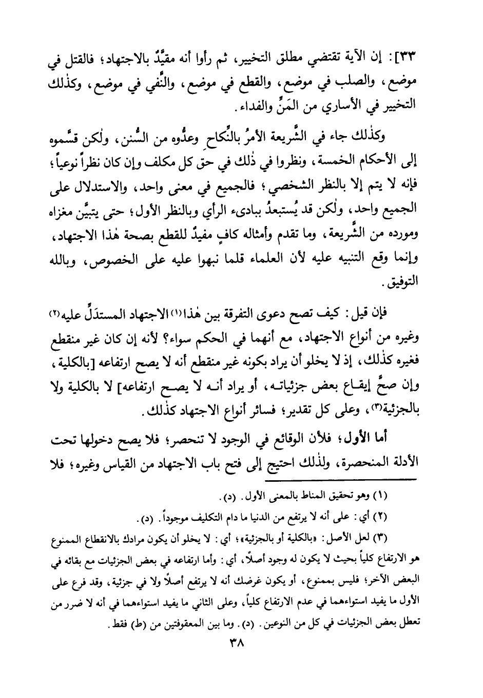 3 لعل الأصل: "بالكلية أو بالجزئية"، أي: لا يخلو أن يكون هناك بالانقطاع الممنوع هو الارتفاع كليًا بحيث لا يكون له وجود أصلًا، أي: وأما ارتفاعه في بعض الجزئيات مع بقائه في البعض الآخر؛ فليس بممنوع، أو يكون غرضك أنه لا يرتفع أصلًا ولا في جزئية، وقد فرع على الأول ما يفيد استواءهما في عدم الارتفاع كليًا، وعلى الثاني ما يفيد استواءهما في أنه لا ضرر في تعطل بعض الجزئيات في كل من النوعين. "د". وما بين المعقوفتين من "ط" فقط.