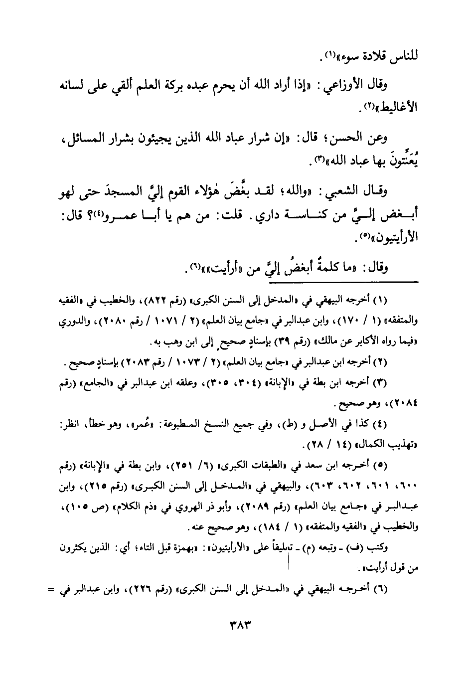 6 أخرجه البيهقي في "المدخل إلى السنن الكبرى" "رقم 226"، وابن عبد البر في الجامع" "رقم 2095"، وابن بطة في "الإبانة" "رقم 605"، وهو صحيح عنه.