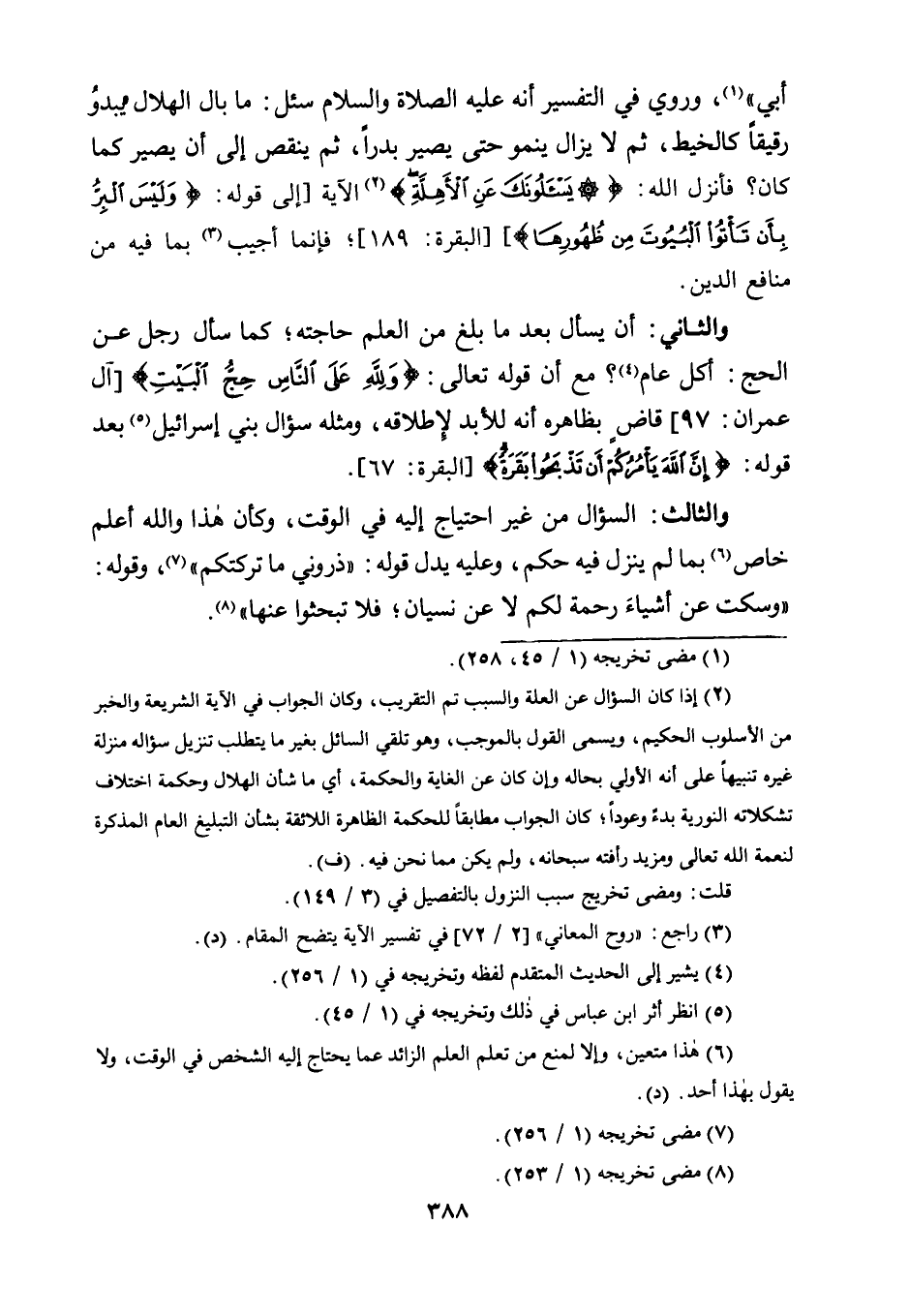 وَالثَّانِي: أَنْ يَسْأَلَ بَعْدَ مَا بَلَغَ مِنَ الْعِلْمِ حَاجَتَهُ؛ كَمَا سَأَلَ الرجل عَنِ الْحَجِّ: أَكُلَّ عَامٍ4؟ مَعَ أَنَّ قَوْلَهُ تَعَالَى: {وَلِلَّهِ عَلَى النَّاسِ حِجُّ الْبَيْتِ} [آلِ عِمْرَانَ: 97] قَاضٍ بِظَاهِرِهِ أَنَّهُ لِلْأَبَدِ لِإِطْلَاقِهِ، وَمِثْلُهُ سُؤَالُ بَنِي إِسْرَائِيلَ5 بَعْدَ قَوْلِهِ: {إِنَّ اللَّهَ يَأْمُرُكُمْ أَنْ تَذْبَحُوا بَقَرَةً} [الْبَقَرَةِ: 67] .