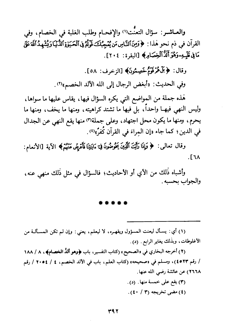 وَالْعَاشِرُ: سُؤَالُ التَّعَنُّتِ1 وَالْإِفْحَامِ وَطَلَبِ الْغَلَبَةِ فِي الْخِصَامِ، وَفِي الْقُرْآنِ فِي ذَمِّ نَحْوِ هَذَا: {وَمِنَ النَّاسِ مَنْ يُعْجِبُكَ قَوْلُهُ فِي الْحَيَاةِ الدُّنْيَا وَيُشْهِدُ اللَّهَ عَلَى مَا فِي قَلْبِهِ وَهُوَ أَلَدُّ الْخِصَامِ} [الْبَقَرَةِ: 204] .