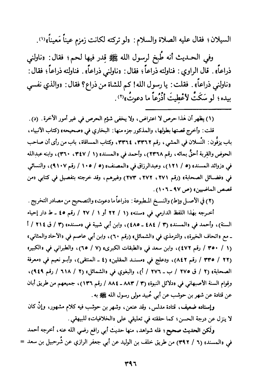 وَفِي الْحَدِيثِ أَنَّهُ طُبِخَ لِرَسُولِ اللَّهِ صَلَّى اللَّهُ عَلَيْهِ وَسَلَّمَ قِدْرٌ فِيهَا لَحْمٌ؛ فَقَالَ: "نَاوِلْنِي ذِرَاعًا". قَالَ الرَّاوِي: فَنَاوَلْتُهُ ذِرَاعًا؛ فَقَالَ: "نَاوِلْنِي ذِرَاعًا". فَنَاوَلْتُهُ ذِرَاعًا؛ فَقَالَ: "نَاوِلْنِي ذِرَاعًا". فَقُلْتُ: يَا رَسُولَ اللَّهِ! كَمْ لِلشَّاةِ مِنْ ذِرَاعٍ؟ فَقَالَ: "وَالَّذِي نَفْسِي بِيَدِهِ؛ لَوْ سَكَتَ لَأُعْطِيتَ أَذْرُعًا مَا دعوت" 2.
