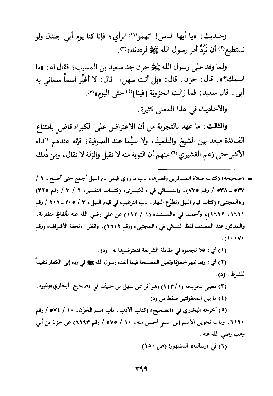 وَالثَّالِثُ: مَا عُهِدَ بِالتَّجْرِبَةِ مِنْ أَنَّ الِاعْتِرَاضَ عَلَى الْكُبَرَاءِ قَاضٍ بِامْتِنَاعِ الْفَائِدَةِ مُبْعِدٌ بَيْنَ الشَّيْخِ وَالتِّلْمِيذِ، وَلَا سِيَّمَا عِنْدَ الصُّوفِيَّةِ؛ فَإِنَّهُ عِنْدَهُمُ الدَّاءُ الْأَكْبَرُ حَتَّى زَعَمَ الْقُشَيْرِيُّ6 عَنْهُمْ أَنَّ التَّوْبَةَ مِنْهُ لَا تُقْبَلُ وَالزَّلَّةُ لَا تُقَالُ، وَمِنْ ذَلِكَ
