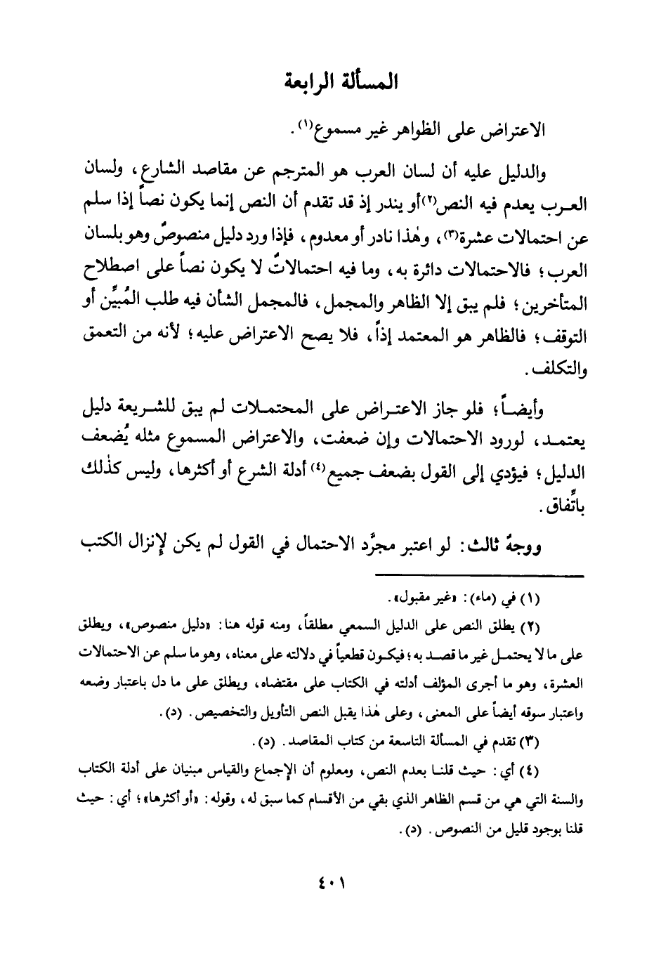وَالدَّلِيلُ عَلَيْهِ أَنَّ لِسَانَ الْعَرَبِ هُوَ الْمُتَرْجِمُ عَنْ مَقَاصِدِ الشَّارِعِ، وَلِسَانُ الْعَرَبِ يُعْدَمُ فِيهِ النص2 أو ينذر إِذْ قَدْ تَقَدَّمَ أَنَّ النَّصَّ إِنَّمَا يَكُونُ نَصًّا إِذَا سَلِمَ عَنِ احْتِمَالَاتٍ عَشْرَةٍ3، وَهَذَا نَادِرٌ أَوْ مَعْدُومٌ، فَإِذَا وَرَدَ دَلِيلٌ مَنْصُوصٌ وَهُوَ بِلِسَانِ الْعَرَبِ؛ فَالِاحْتِمَالَاتُ دَائِرَةٌ بِهِ، وَمَا فِيهِ احْتِمَالَاتٌ لَا يَكُونُ نَصًّا عَلَى اصْطِلَاحِ الْمُتَأَخِّرِينَ؛ فَلَمْ يَبْقَ إِلَّا الظَّاهِرُ وَالْمُجْمَلُ، فَالْمُجْمَلُ الشَّأْنُ فِيهِ طَلَبُ الْمُبَيِّنِ أَوِ التَّوَقُّفُ؛ فَالظَّاهِرُ هو المعتمد إذن، فَلَا يَصِحُّ الِاعْتِرَاضُ عَلَيْهِ؛ لِأَنَّهُ مِنَ التَّعَمُّقِ وَالتَّكَلُّفِ.