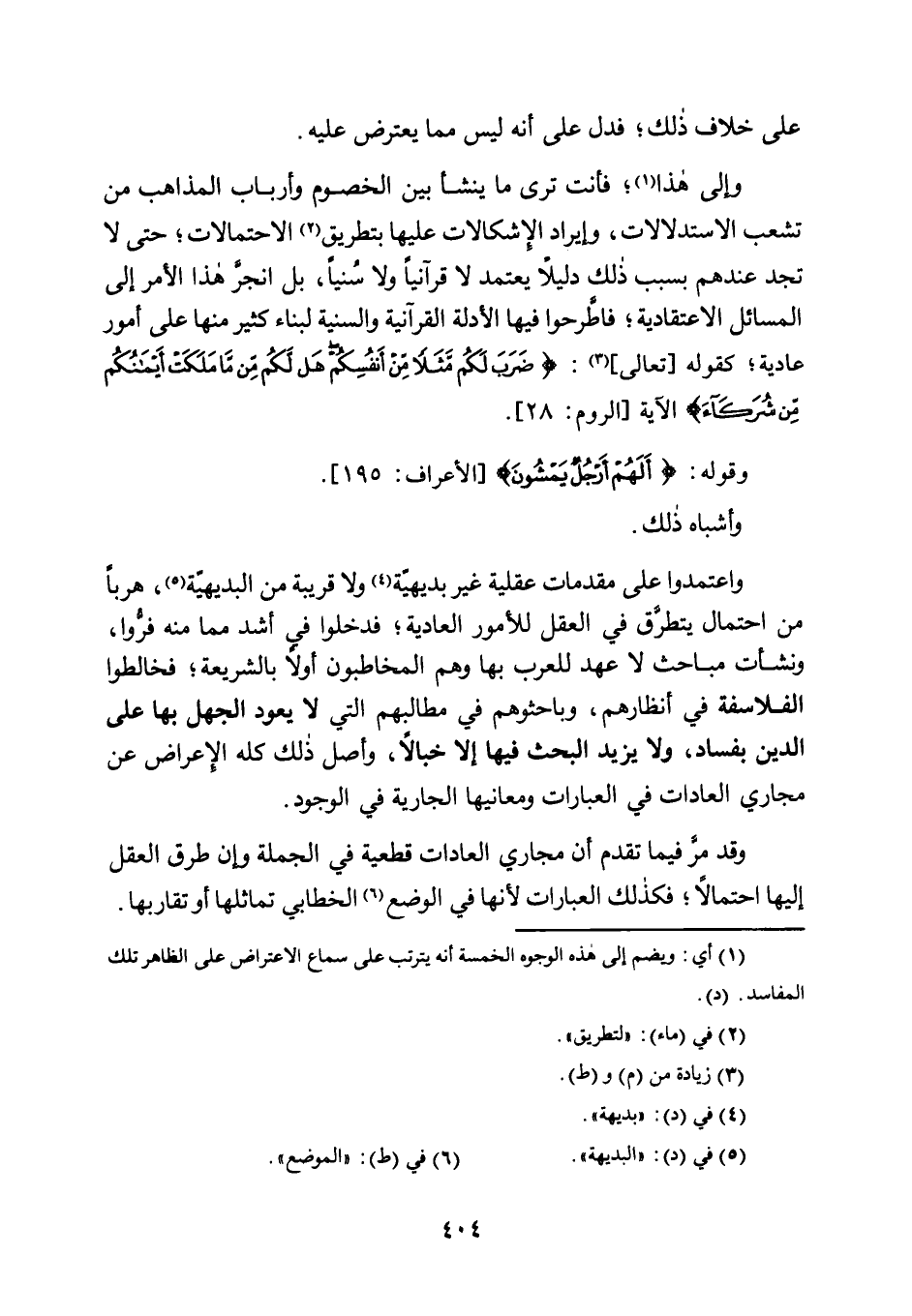 وَاعْتَمَدُوا عَلَى مقدمات عقلية غير بديهة4 وَلَا قَرِيبَةٍ مِنَ البديهيَّة5، هَرَبًا مِنَ احْتِمَالٍ يَتَطَرَّقُ فِي الْعَقْلِ لِلْأُمُورِ الْعَادِيَّةِ؛ فَدَخَلُوا فِي أَشَدَّ مِمَّا مِنْهُ فرُّوا، وَنَشَأَتْ مَبَاحِثُ لَا عَهْدَ لِلْعَرَبِ بِهَا وَهُمُ الْمُخَاطَبُونَ أَوَّلًا بِالشَّرِيعَةِ؛ فَخَالَطُوا الْفَلَاسِفَةَ فِي أَنْظَارِهِمْ، وَبَاحَثُوهُمْ فِي مَطَالِبِهِمُ الَّتِي لَا يَعُودُ الْجَهْلُ بِهَا عَلَى الدِّينِ بِفَسَادٍ، وَلَا يَزِيدُ الْبَحْثُ فِيهَا إِلَّا خَبَالًا، وَأَصْلُ ذَلِكَ كُلُّهُ الْإِعْرَاضُ عَنْ مَجَارِي الْعَادَاتِ فِي الْعِبَارَاتِ وَمَعَانِيهَا الْجَارِيَةِ فِي الْوُجُودِ.