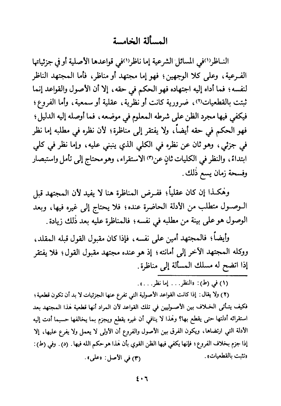 النَّاظِرُ1 فِي الْمَسَائِلِ الشَّرْعِيَّةِ إِمَّا نَاظِرٌ1 فِي قَوَاعِدِهَا الْأَصْلِيَّةِ أَوْ فِي جُزْئِيَّاتِهَا الْفَرْعِيَّةِ، وَعَلَى كِلَا الْوَجْهَيْنِ؛ فَهُوَ إِمَّا مُجْتَهِدٌ أَوْ مُنَاظِرٌ، فَأَمَّا الْمُجْتَهِدُ النَّاظِرُ لِنَفْسِهِ؛ فَمَا أَدَّاهُ إِلَيْهِ اجْتِهَادُهُ فَهُوَ الْحُكْمُ فِي حَقِّهِ؛ إِلَّا أَنَّ الْأُصُولَ وَالْقَوَاعِدَ إِنَّمَا ثَبَتَتْ بِالْقَطْعِيَّاتِ2؛ ضَرُورِيَّةً كَانَتْ أَوْ نَظَرِيَّةً؛ عَقْلِيَّةً أَوْ سَمْعِيَّةً، وَأَمَّا الْفُرُوعُ؛ فَيَكْفِي فِيهَا مُجَرَّدُ الظَّنِّ عَلَى شَرْطِهِ الْمَعْلُومِ فِي مَوْضِعِهِ، فَمَا أَوْصَلَهُ إِلَيْهِ الدَّلِيلُ؛ فَهُوَ الْحُكْمُ فِي حَقِّهِ أَيْضًا، وَلَا يَفْتَقِرُ إِلَى مُنَاظَرَةٍ؛ لِأَنَّ نَظَرَهُ فِي مَطْلَبِهِ إِمَّا نَظَرٌ فِي جُزْئِيٍّ، وَهُوَ ثانٍ عَنْ نَظَرِهِ فِي الْكُلِّيِّ الَّذِي يَنْبَنِي عَلَيْهِ، وَإِمَّا نَظَرٌ فِي كُلِّيٍّ ابْتِدَاءً، وَالنَّظَرُ فِي الْكُلِّيَّاتِ ثانٍ عَنِ3 الِاسْتِقْرَاءِ، وَهُوَ مُحْتَاجٌ إِلَى تَأَمُّلٍ وَاسْتِبْصَارٍ وَفُسْحَةِ زَمَانٍ يَسَعُ ذَلِكَ.