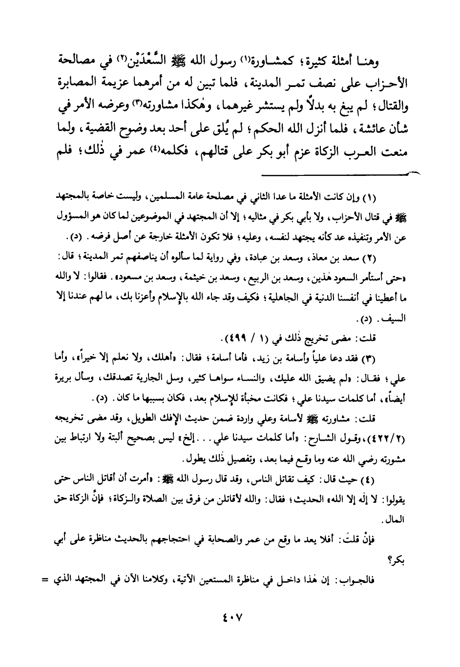 1 وإن كانت الأمثلة ما عدا الثاني في مصلحة عامة المسلمين، وليست خاصة بالمجتهد صلى الله عليه وسلم في قتال الأحزاب، ولا بأبي بكر في مثاليه؛ إلا أن المجتهد في الموضوعين لما كان هو المسئول عن الأمر وتنفيذه عُدَ كأنه يجتهد لنفسه، وعليه؛ فلا تكون الأمثلة خارجة عن أصل فرضه. "د".