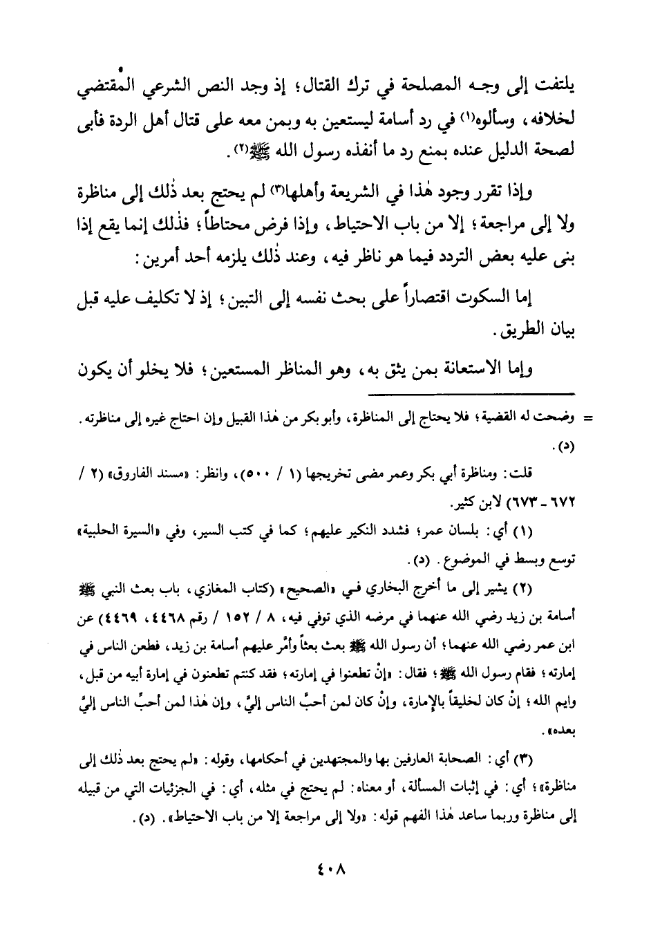 3 أي: الصحابة العارفين بها والمجتهدين في أحكامها، وقوله: "لم يحتج بعد ذلك إلى مناظرة"؛ أي: في إثبات المسألة، أو معناه: لم يحتج في مثله، أي: في الجزئيات التي من قبيله إلى مناظرة وربما ساعد هذا الفهم قوله: "ولا إلى مراجعة إلا من باب الاحتياط". "د".