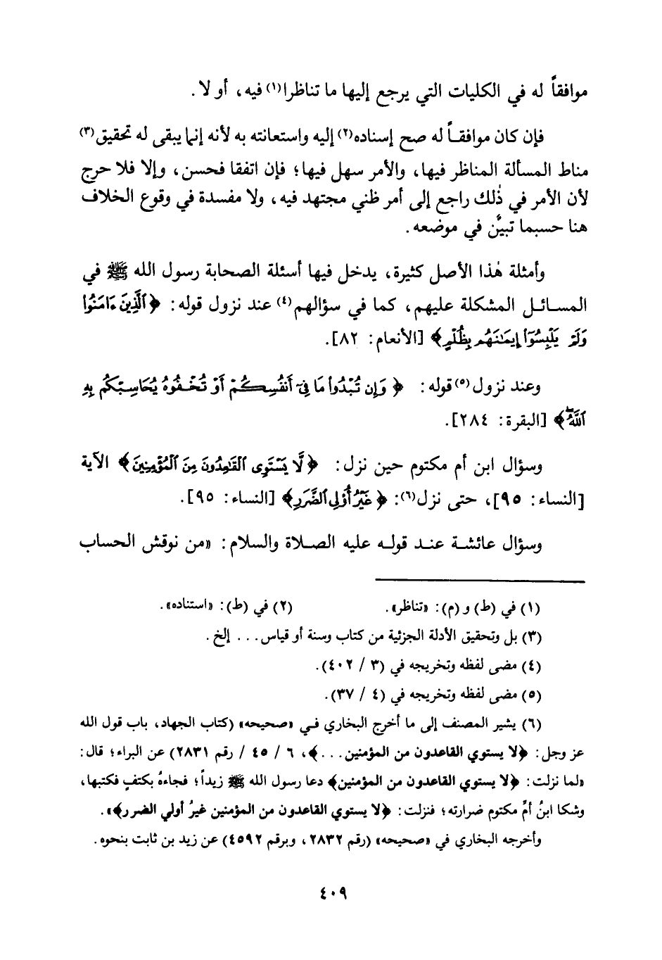 وسؤال ابن أم كتوم حِينَ نَزَلَ: {لَا يَسْتَوِي الْقَاعِدُونَ مِنَ الْمُؤْمِنِين} الْآيَةَ [النِّسَاءِ: 95] ، حَتَّى نَزَلَ6 {غَيْرُ أُولِي الضَّرَر} [النِّسَاءِ: 95] .