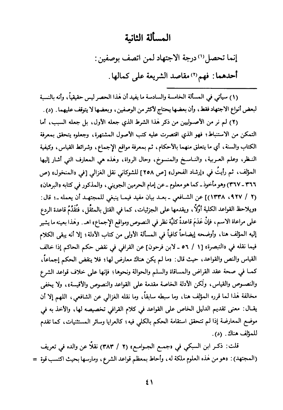 1 سيأتي في المسألة الخامسة والسادسة ما يفيد أن هذا الحصر ليس تحقيقًا، وأنه بالنسبة لبعض أنواع الاجتهاد فقط، وأن بعضها يحتاج لأكثر من الوصفين، وبعضها لا يتوقف عليهما. "د".