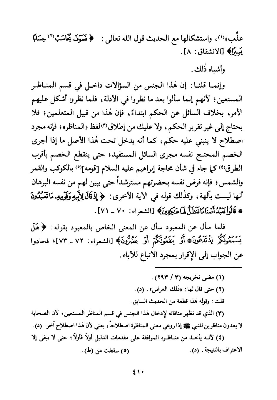 وَإِنَّمَا قُلْنَا: إِنَّ هَذَا الْجِنْسَ مِنَ السُّؤَالَاتِ دَاخِلٌ فِي قِسْمِ الْمُنَاظِرِ الْمُسْتَعِينِ؛ لِأَنَّهُمْ إِنَّمَا سَأَلُوا بَعْدَ مَا نَظَرُوا فِي الْأَدِلَّةِ، فَلَمَّا نَظَرُوا أُشْكِلَ عَلَيْهِمُ الْأَمْرُ، بِخِلَافِ السَّائِلِ عَنِ الحكم ابْتِدَاءً، فَإِنَّ هَذَا مِنْ قَبِيلِ الْمُتَعَلِّمِينَ؛ فَلَا يَحْتَاجُ إِلَى غَيْرِ تَقْرِيرِ الْحُكْمِ، وَلَا عَلَيْكَ مِنْ إِطْلَاقِ3 لَفْظِ "الْمُنَاظِرِ" فَإِنَّهُ مُجَرَّدُ اصْطِلَاحٍ لَا يَنْبَنِي عَلَيْهِ حُكْمٌ، كَمَا أَنَّهُ يَدْخُلُ تَحْتَ هَذَا الْأَصْلِ مَا إِذَا أَجْرَى الْخَصْمُ الْمُحْتَجُّ نَفْسَهُ مَجْرَى السَّائِلِ الْمُسْتَفِيدِ؛ حَتَّى يَنْقَطِعَ الْخَصْمُ بِأَقْرَبِ الطُّرُقِ4 كَمَا جَاءَ فِي شَأْنِ حاجة إِبْرَاهِيمَ عَلَيْهِ السَّلَامُ [قَوْمَهُ] 5 بِالْكَوْكَبِ وَالْقَمَرِ وَالشَّمْسِ؛ فَإِنَّهُ فَرَضَ نَفْسَهُ بِحَضْرَتِهِمْ مُسْتَرْشِدًا حَتَّى يُبَيِّنَ لَهُمْ مِنْ نَفْسِهِ الْبُرْهَانَ أَنَّهَا لَيْسَتْ بِآلِهَةٍ، وَكَذَلِكَ قَوْلُهُ فِي الْآيَةِ الْأُخْرَى: {إِذْ قَالَ لِأَبِيهِ وَقَوْمِهِ مَا هَذِهِ التَّمَاثِيلُ الَّتِي أَنْتُمْ لَهَا عَاكِفُونَ} [الشُّعَرَاءِ: 70-71] .