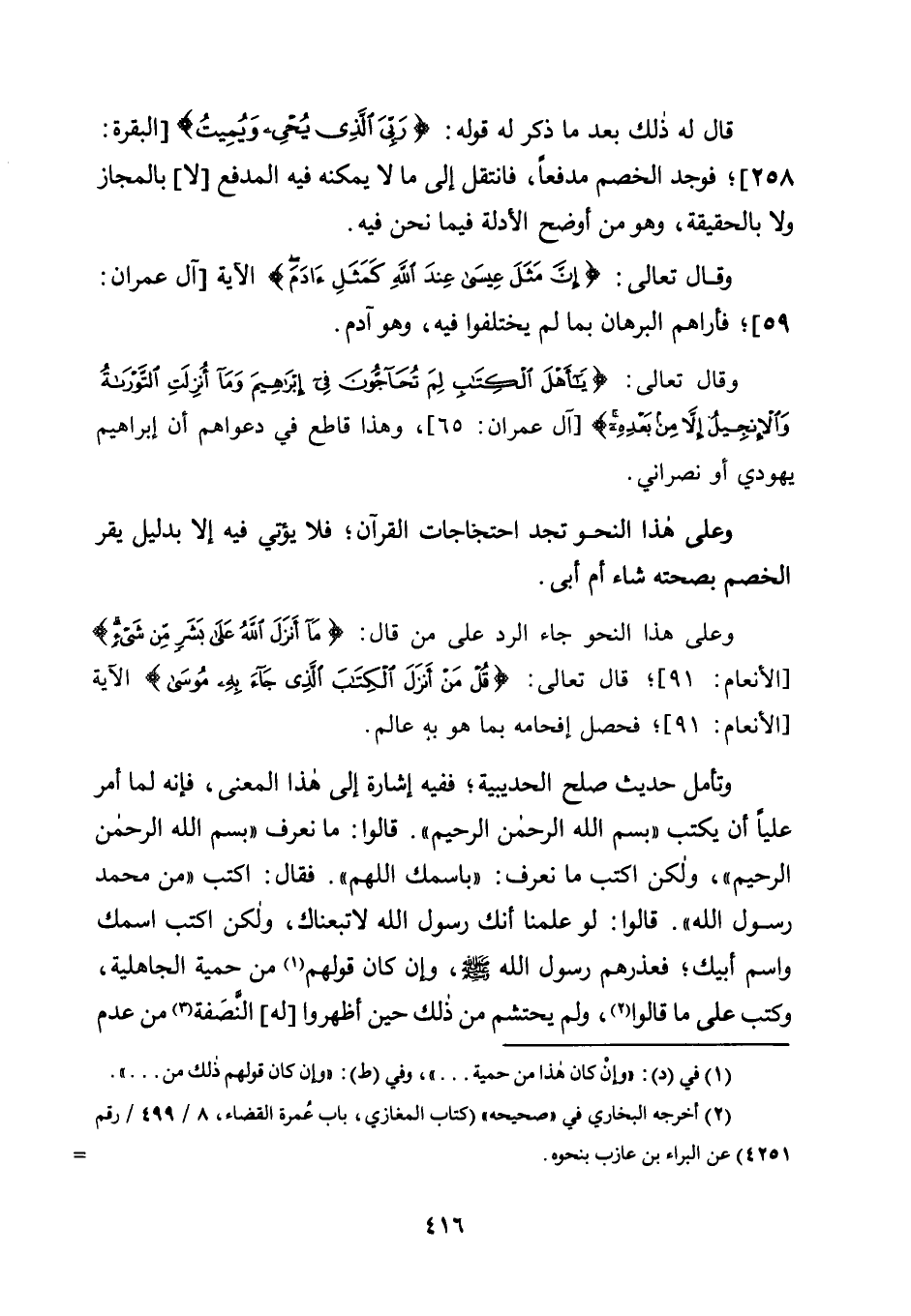 وَتَأَمَّلْ حَدِيثَ صُلْحِ الْحُدَيْبِيَةِ؛ فَفِيهِ إِشَارَةٌ إِلَى هَذَا الْمَعْنَى، فَإِنَّهُ لَمَّا أَمَرَ عَلِيًّا أَنْ يَكْتُبَ "بِسْمِ اللَّهِ الرَّحْمَنِ الرَّحِيمِ". قَالُوا: مَا نَعْرِفُ "بِسْمِ اللَّهِ الرَّحْمَنِ الرَّحِيمِ"، وَلَكِنِ اكْتُبْ مَا نَعْرِفُ: "بِاسْمِكَ اللَّهُمَّ". فَقَالَ: " اكْتُبْ: مِنْ مُحَمَّدٍ رَسُولِ اللَّهِ"، قَالُوا: لَوْ عَلِمْنَا أَنَّكَ رَسُولُ اللَّهِ لَاتَّبَعْنَاكَ، وَلَكِنِ اكْتُبِ اسْمَكَ وَاسْمَ أَبِيكَ؛ فَعَذَرَهُمْ رَسُولُ اللَّهِ صَلَّى اللَّهُ عَلَيْهِ وَسَلَّمَ، وَإِنْ كَانَ قَوْلُهُمْ1 مِنْ حَمِيَّةِ الْجَاهِلِيَّةِ، وَكَتَبَ عَلَى مَا قَالُوا2، وَلَمْ يَحْتَشِمْ مِنْ ذَلِكَ حِينَ أَظْهَرُوا [لَهُ] النَّصَفة من عدم