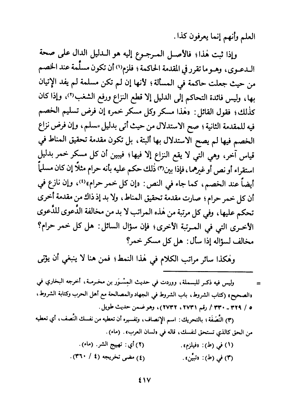 وَإِذَا ثَبَتَ هَذَا؛ فَالْأَصْلُ الْمَرْجُوعُ إِلَيْهِ هُوَ الدَّلِيلُ الدَّالُّ على صحة الدعوى، وهو ماتقرر فِي الْمُقَدِّمَةِ الْحَاكِمَةِ؛ فَلَزِمَ1 أَنْ تَكُونَ مُسَلَّمَةً عِنْدَ الْخَصْمِ مِنْ حَيْثُ جُعِلَتْ حَاكِمَةً فِي المسألة؛ لأنها إن لم مُسَلَّمَةً لَمْ يُفِدِ الْإِتْيَانُ بِهَا، وَلَيْسَ فَائِدَةُ التحام إِلَى الدَّلِيلِ إِلَّا قَطْعَ النِّزَاعِ وَرَفْعَ الشَّغَبِ2، وَإِذَا كَانَ كَذَلِكَ؛ فَقَوْلُ الْقَائِلِ: "هَذَا مُسْكِرٌ وَكُلُّ مُسْكِرٍ خَمْرٌ" إِنْ فُرِضَ تَسْلِيمُ الْخَصْمِ فِيهِ لِلْمُقَدِّمَةِ الثَّانِيَةِ؛ صَحَّ الِاسْتِدْلَالُ مِنْ حَيْثُ أَتَى بِدَلِيلٍ مُسَلَّمٍ، وَإِنْ فُرِضَ نِزَاعُ الْخَصْمِ فِيهَا لَمْ يَصِحَّ الِاسْتِدْلَالُ بِهَا أَلْبَتَّةَ، بَلْ تَكُونُ مُقَدِّمَةَ تَحْقِيقِ الْمَنَاطِ فِي قِيَاسٍ آخَرَ، وَهِيَ الَّتِي لَا يَقَعُ النِّزَاعُ إِلَّا فِيهَا؛ فَيُبَيِّنُ أَنَّ كُلَّ مُسْكِرٍ خَمْرٌ بِدَلِيلِ اسْتِقْرَاءٍ أَوْ نَصٍّ أَوْ غَيْرِهِمَا، فَإِذَا بَيَّنَ3 ذَلِكَ حُكِمَ عَلَيْهِ بِأَنَّهُ حَرَامٌ مثلُا إِنْ كَانَ مُسَلَّمًا أَيْضًا عِنْدَ الْخَصْمِ، كَمَا جَاءَ فِي النَّصِّ: "إِنَّ كُلَّ خَمْرٍ حَرَامٌ" 4، وَإِنْ نَازَعَ فِي أَنَّ كُلَّ خَمْرٍ حَرَامٌ؛ صَارَتْ مُقَدِّمَةَ تَحْقِيقِ الْمَنَاطِ، وَلَا بُدَّ إِذْ ذَاكَ مِنْ مُقَدِّمَةٍ أُخْرَى تَحْكُمُ عَلَيْهَا، وَفِي كُلِّ مَرْتَبَةٍ مِنْ هَذِهِ الْمَرَاتِبِ لَا بُدَّ مِنْ مُخَالَفَةِ الدَّعْوَى لِلدَّعْوَى الْأُخْرَى الَّتِي فِي الْمَرْتَبَةِ الْأُخْرَى؛ فَإِنَّ سُؤَالَ السَّائِلِ: هَلْ كُلُّ خَمْرٍ حَرَامٌ؟ مُخَالِفٌ لِسُؤَالِهِ إِذَا سَأَلَ: هَلْ كُلُّ مُسْكِرٍ خَمْرٌ؟