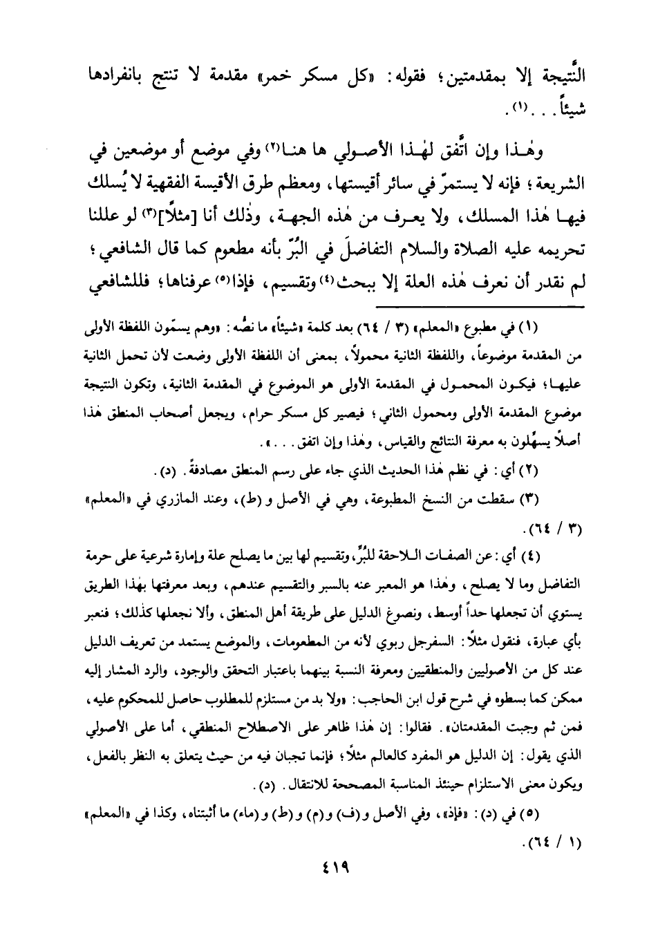 4 أي: عن الصفات اللاحقة للبُرِّ، وتقسيم لها بين ما يصلح علة وإمارة شرعية على حرمة التفاضل وما يصلح، وهذا هو المعبر عنه بالسبر والتقسيم عندهم، وبعد معرفتها بهذا الطريق يستوي أن تجعلها حدًا أوسط، ونصوغ الدليل على طريقة أهل المنطق، وألا نجعلها كذلك؛ فنعبر بأي عبارة، فنقول مثلُا: السفرجل ربوي لأنه من المطعومات، والموضع يستمد من تعريف الدليل عند كل من الأصوليين والمنطقيين ومعرفلة النسبة بينهما باعتبار التحقق والوجود، والرد المشار إليه ممكن كما بسطوه في شرح قول ابن الحاج: "ولا بد من مستلزم للمطلوب حاصل للمحكوم عليه، فمن ثم وجبت المقدمتان". فقالوا: إن هذا ظاهر على الاصطلاح المنطقي، أما على الأصولي الذي يقول: إن الدليل هو المفرد كالعالم مثلُا، فإنما تجبان فيه من حيث يتعلق به النظر بالفعل، ويكون معنى الاستلزام حينئذ المناسبة المصححة للانتقال. "د".