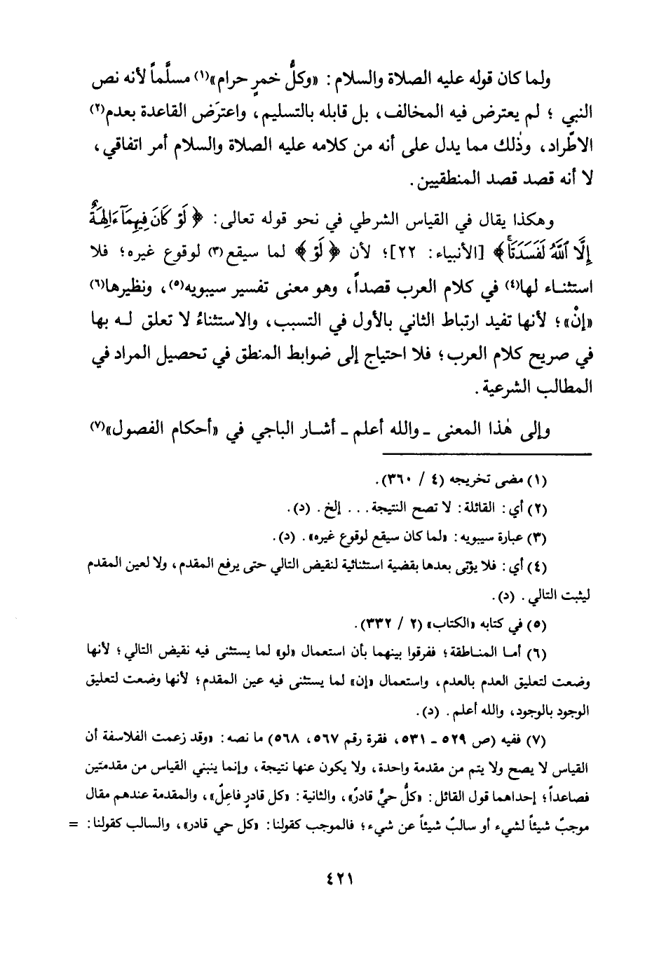 ولما كان قوله عليه الصلاة نالسلام: "وَكُلُّ خَمْرٍ حَرَامٌ" 1 مُسَلَّمًا؛ لِأَنَّهُ نَصُّ النَّبِيِّ؛ لَمْ يَعْتَرِضْ فِيهِ الْمُخَالِفُ، بَلْ قَابَلَهُ بِالتَّسْلِيمِ، واعترض القاعدة بعدم2 الطراد، وَذَلِكَ مِمَّا يَدُلُّ عَلَى أَنَّهُ مِنْ كَلَامِهِ عَلَيْهِ الصَّلَاةُ وَالسَّلَامُ أَمْرٌ اتِّفَاقِيٌّ، لَا أَنَّهُ قَصَدَ قَصْدَ الْمَنْطِقِيِّينَ.