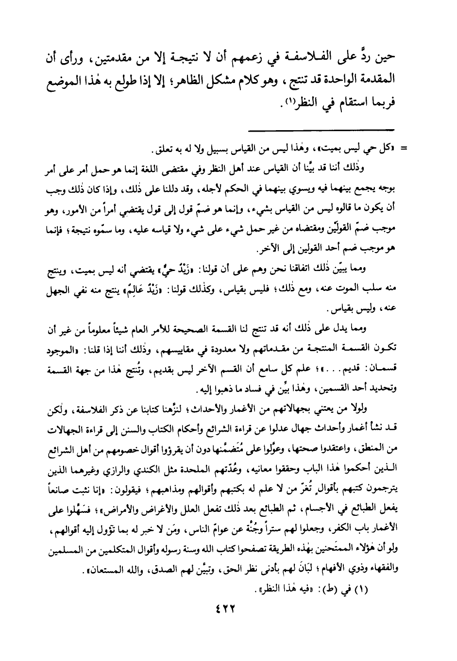 حِينَ رَدَّ عَلَى الْفَلَاسِفَةِ فِي زَعْمِهِمْ أَنَّ لَا نَتِيجَةَ إِلَّا مِنْ مُقَدِّمَتَيْنِ، وَرَأَى أَنَّ الْمُقَدِّمَةَ الْوَاحِدَةَ قَدْ تُنْتِجُ، وَهُوَ كَلَامٌ مُشْكِلُ الظَّاهِرِ؛ إِلَّا إِذَا طُولِعَ بِهِ هَذَا الْمَوْضِعُ فربما استقام في النظر1.