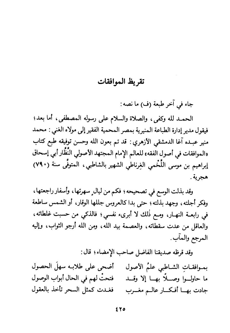 الحمد الله وكفى، والصلاة والسلام على رسوله المصطفى، أما بعد؛ فيقول مدير إدارة الطباعة المنيرية بمصر المحمية الفقيرة إلى مولاه الغني: محمد منير عبده آغا الدمشقي الأزهري: قد تم بعون الله وحسن توفيقه طبع كتاب "الموافقات في أصول الفقه" للعالم الإمام المجتهد الأصولي النظار أبي أسحاق إبراهيم بن موسى اللخمي الغرناطي الشهير بالشاطبي، المتوفى سنة "790" هجرية.