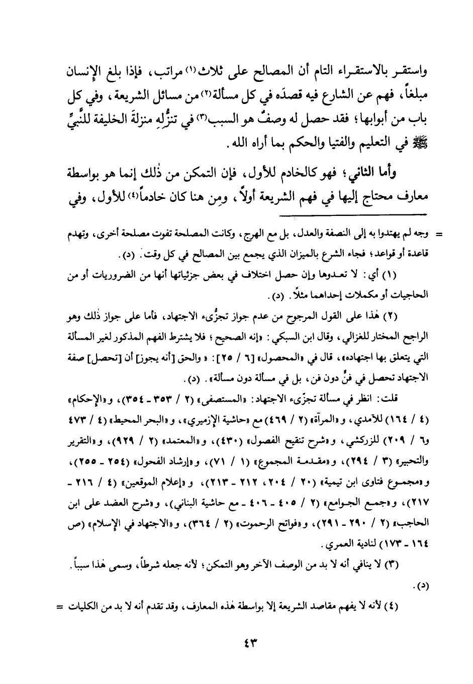 وَاسْتَقَرَّ بِالِاسْتِقْرَاءِ التَّامِّ أَنْ الْمَصَالِحَ عَلَى ثَلَاثِ1 مَرَاتِبَ، فَإِذَا بَلَغَ الْإِنْسَانُ مَبْلَغًا، فَهِمَ عَنِ الشَّارِعِ فِيهِ قَصْدَهُ فِي كُلِّ مَسْأَلَةٍ2 مِنْ مَسَائِلِ الشَّرِيعَةِ، وَفِي كُلِّ بَابٍ مِنْ أَبْوَابِهَا فَقَدْ حَصَلَ لَهُ وَصْفٌ هُوَ السَّبَبُ3 فِي تَنَزُّلِهِ مَنْزِلَةَ الْخَلِيفَةِ لِلنَّبِيِّ صَلَّى اللَّهُ عَلَيْهِ وَسَلَّمَ فِي التَّعْلِيمِ وَالْفُتْيَا وَالْحُكْمِ بِمَا أَرَاهُ اللَّهُ.