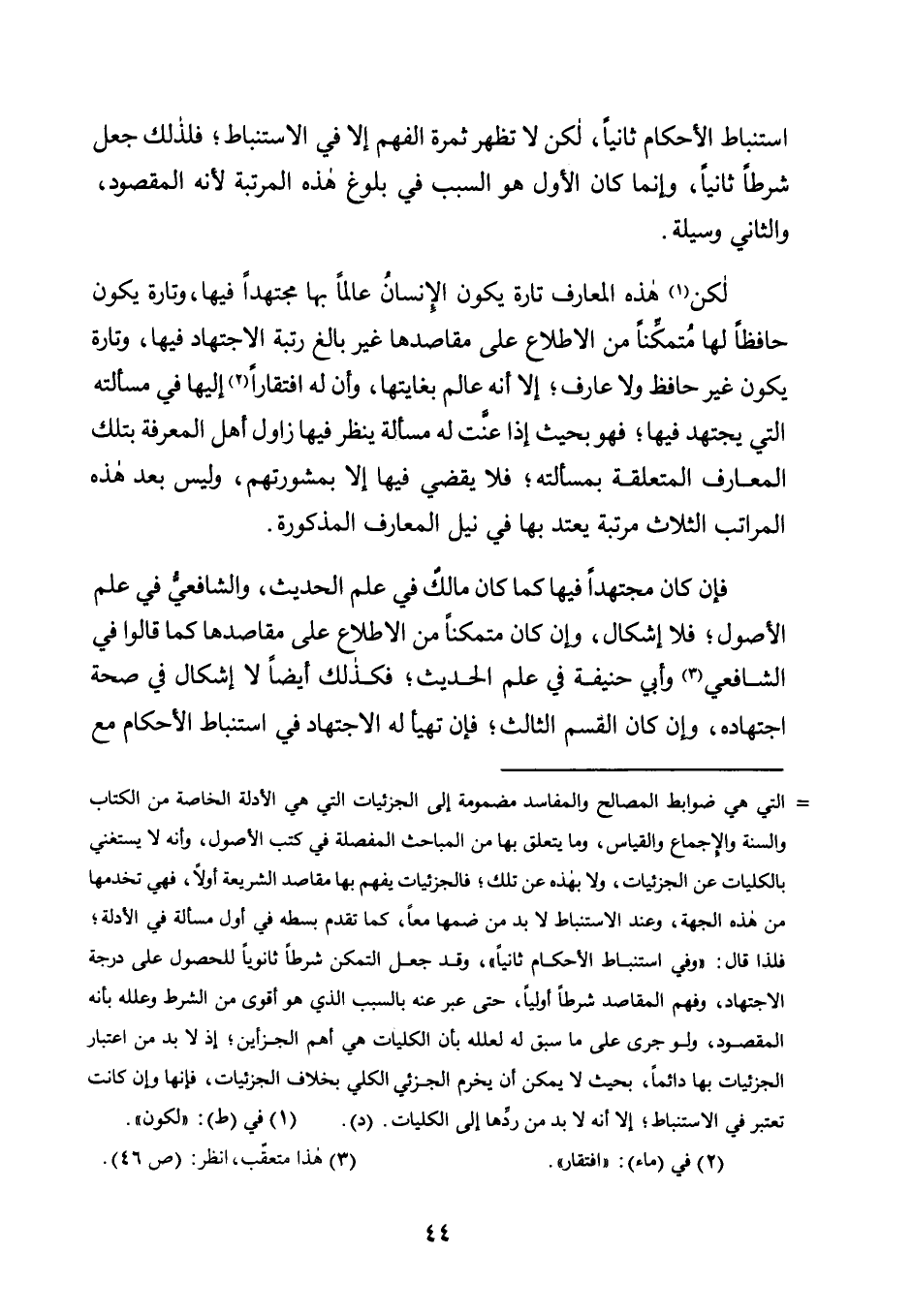 لَكِنَّ1 هَذِهِ الْمَعَارِفَ تَارَةً يَكُونُ الْإِنْسَانُ عَالِمًا بِهَا مُجْتَهِدًا فِيهَا، وَتَارَةً يَكُونُ حَافِظًا لَهَا مُتَمَكِّنًا مِنَ الِاطِّلَاعِ عَلَى مَقَاصِدِهَا غَيْرَ بَالِغٍ رُتْبَةَ الِاجْتِهَادِ فِيهَا، وَتَارَةً يَكُونُ غَيْرَ حَافِظٍ وَلَا عَارِفٍ؛ إِلَّا أَنَّهُ عَالِمٌ بِغَايَتِهَا وَأَنَّ لَهُ افْتِقَارًا2 إِلَيْهَا فِي مَسْأَلَتِهِ الَّتِي يَجْتَهِدُ فِيهَا؛ فَهُوَ بِحَيْثُ إِذَا عَنَّتْ لَهُ مَسْأَلَةٌ يَنْظُرُ فِيهَا زَاوَلَ أَهْلَ الْمَعْرِفَةِ بِتِلْكَ الْمَعَارِفِ الْمُتَعَلِّقَةِ بِمَسْأَلَتِهِ؛ فَلَا يَقْضِي فِيهَا إِلَّا بِمَشُورَتِهِمْ، وَلَيْسَ بَعْدَ هَذِهِ الْمَرَاتِبِ الثَّلَاثِ مَرْتَبَةٌ يُعْتَدُّ بِهَا فِي نَيْلِ الْمَعَارِفِ الْمَذْكُورَةِ.