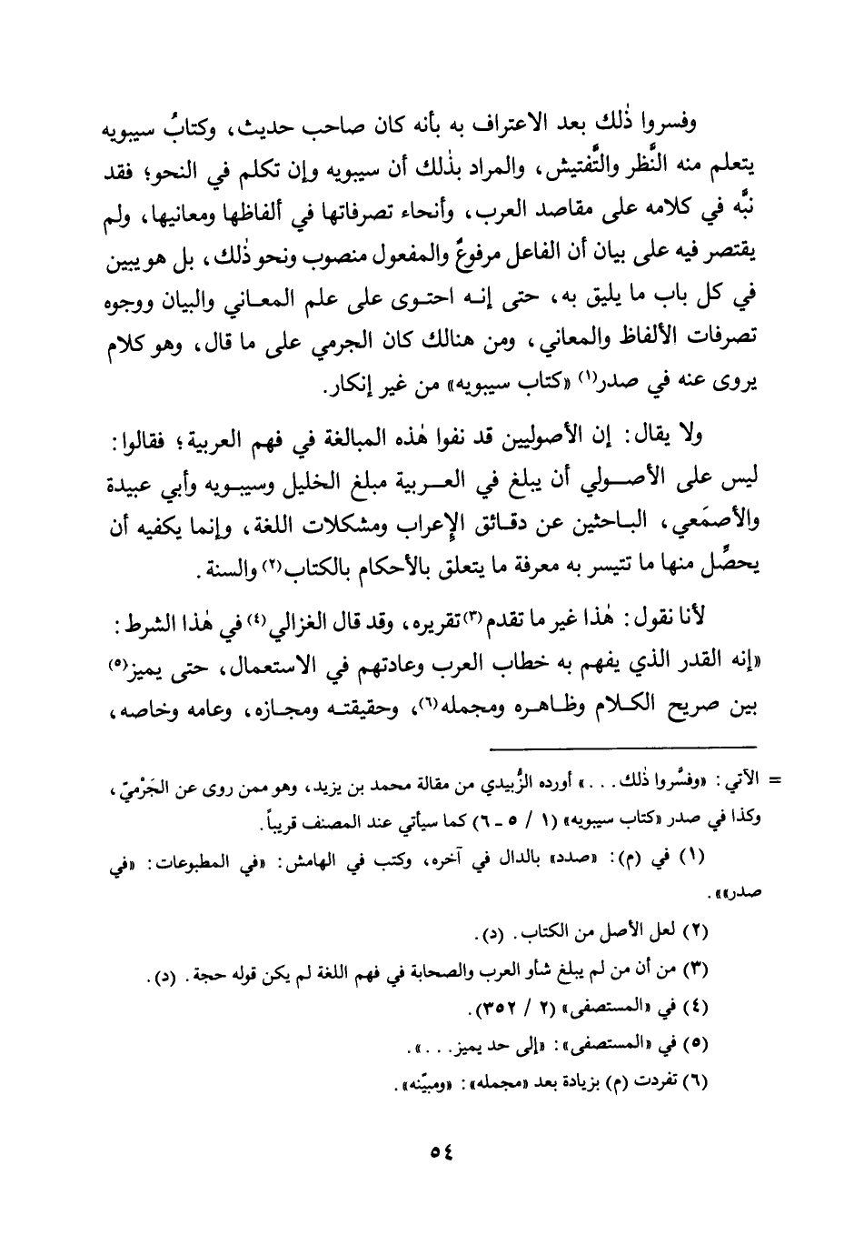 وَلَا يُقَالُ: إِنَّ الْأُصُولِيِّينَ قَدْ نَفَوْا هَذِهِ الْمُبَالَغَةَ فِي فَهْمِ الْعَرَبِيَّةِ؛ فَقَالُوا: لَيْسَ عَلَى الْأُصُولِيِّ أَنْ يَبْلُغَ فِي الْعَرَبِيَّةِ مَبْلَغَ الْخَلِيلِ وَسِيبَوَيْهِ وَأَبِي عُبَيْدَةَ وَالْأَصْمَعِيِّ، الْبَاحِثِينَ عَنْ دَقَائِقِ الْإِعْرَابِ وَمُشْكِلَاتِ اللُّغَةِ، وَإِنَّمَا يَكْفِيهِ أَنْ يَحْصُلَ مِنْهَا مَا تَتَيَسَّرُ بِهِ مَعْرِفَةُ مَا يَتَعَلَّقُ بِالْأَحْكَامِ بِالْكِتَابِ2 وَالسُّنَّةِ.
