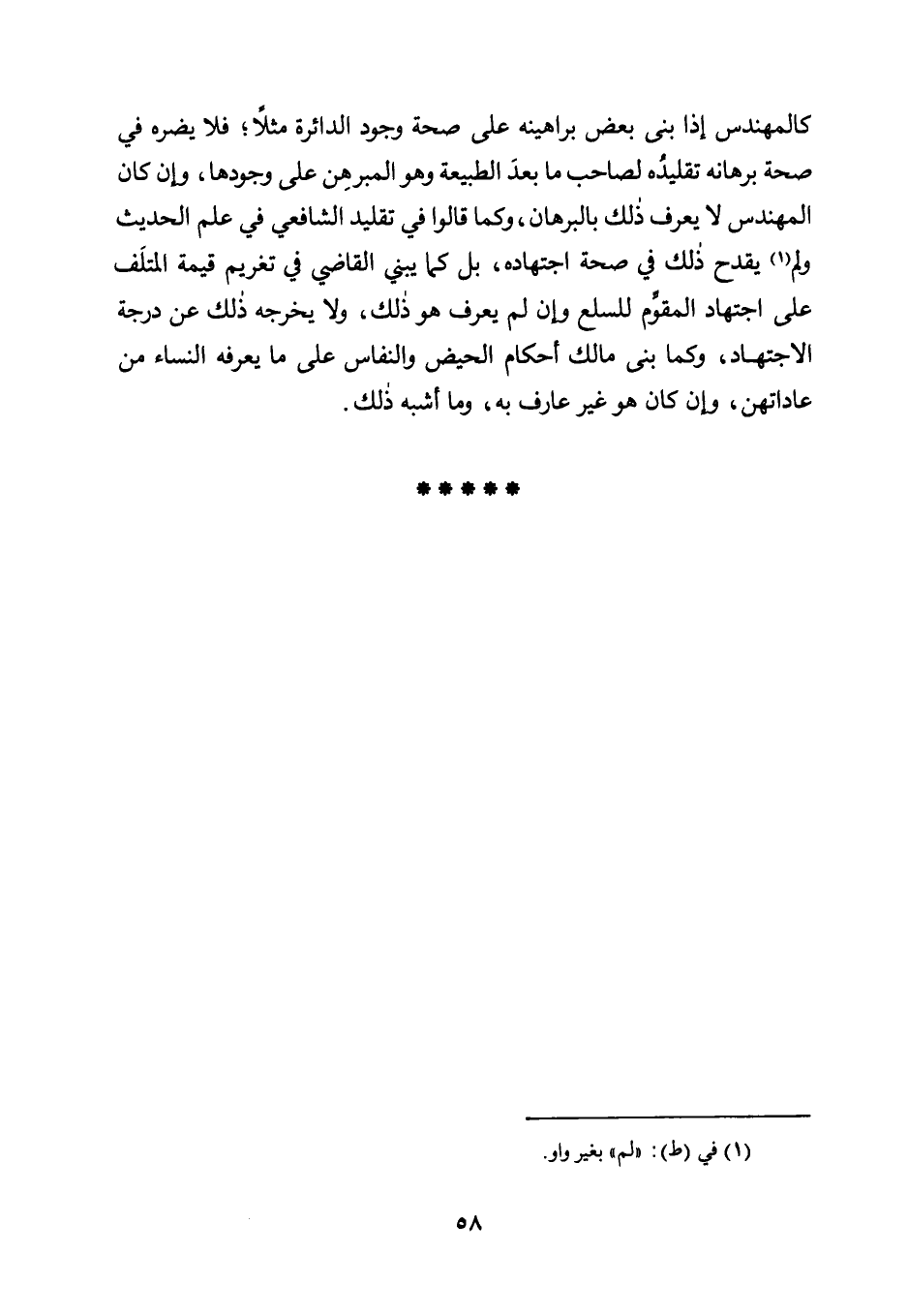 كَالْمُهَنْدِسِ إِذَا بَنَى بَعْضَ بَرَاهِينِهِ عَلَى صِحَّةِ وجود الدئراة مثلًا: فلا يضره في صحة برهان تَقْلِيدُهُ لِصَاحِبِ مَا بَعْدَ الطَّبِيعَةِ وَهُوَ الْمُبَرْهِنُ عَلَى وُجُودِهَا، وَإِنْ كَانَ الْمُهَنْدِسُ لَا يَعْرِفُ ذَلِكَ بِالْبُرْهَانِ، وَكَمَا قَالُوا فِي تَقْلِيدِ الشَّافِعِيِّ في علم الحديث ولم يقدح ذلك من صِحَّةِ اجْتِهَادِهِ، بَلْ كَمَا يَبْنِي الْقَاضِي فِي تَغْرِيمِ قِيمَةِ الْمُتْلَفِ عَلَى اجْتِهَادِ الْمُقَوِّمِ لِلسِّلَعِ وَإِنْ لَمْ يَعْرِفْ هُوَ ذَلِكَ، وَلَا يُخْرِجُهُ ذَلِكَ عَنْ دَرَجَةِ الِاجْتِهَادِ، وَكَمَا بَنَى مَالِكٌ أَحْكَامَ الْحَيْضِ وَالنِّفَاسِ عَلَى مَا يَعْرِفُهُ النِّسَاءُ مِنْ عَادَاتِهِنَّ، وَإِنْ كَانَ هُوَ غَيْرَ عَارِفٍ به، وما أشبه ذلك.