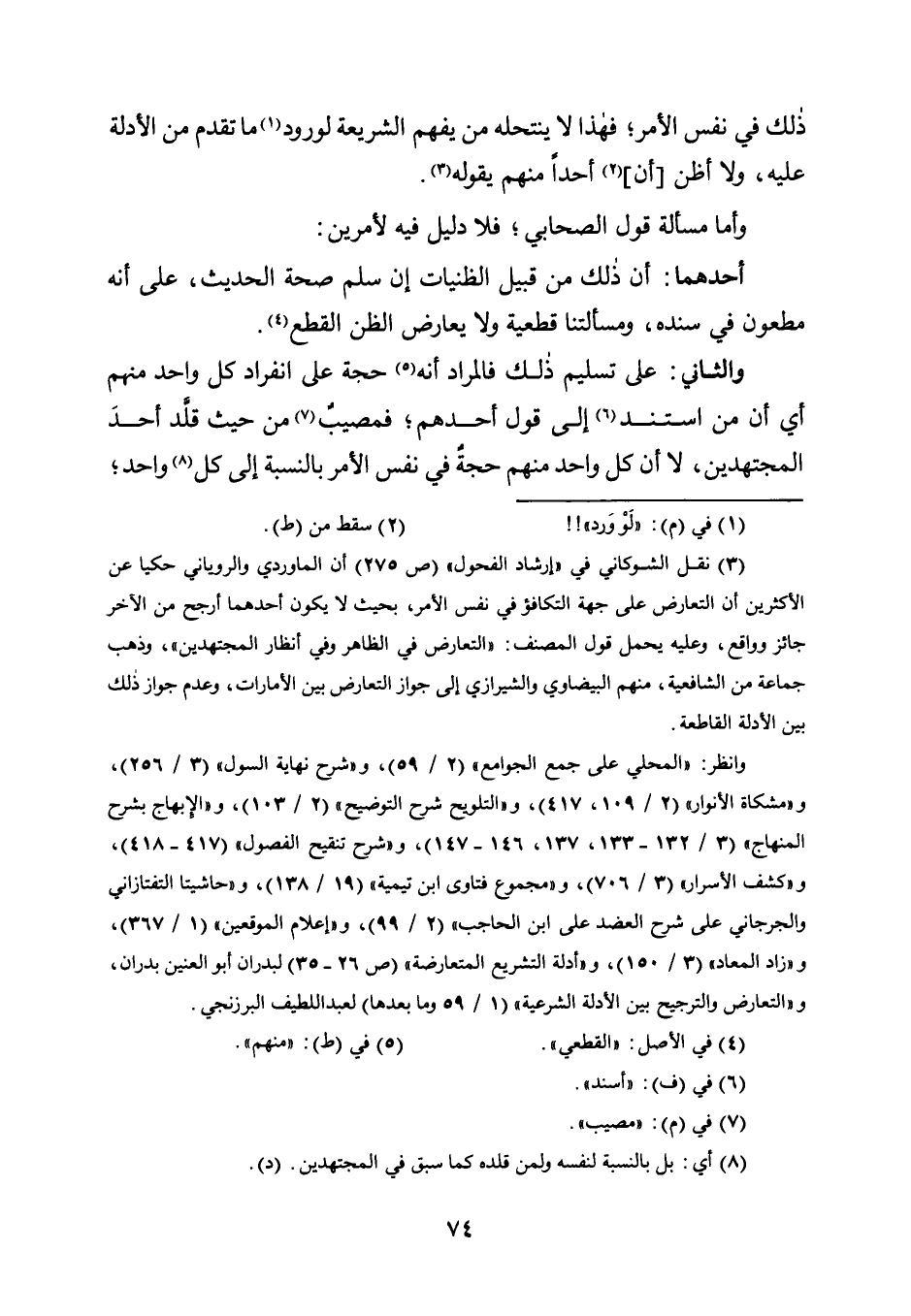 3 نقل الشوكاني في "إرشاد الفحول" "ص275" أن الماوردي والروياني حكيا عن الأكثرين أن التعارض على جهة التكافؤ في نفس الأمر، بحيث لا يكون أحدهما أرجح من الأخر جائز وواقع، وعليه يحمل قول المصنف: "التعارض في الظاهر وفي أنظار المجتهدين"، وذهب جماعة من الشافعية، منهم البيضاوي والشيرازي إلى جواز التعارض بين الأمارات، وعدم جواز ذلك بين الأدلة القاطعة.