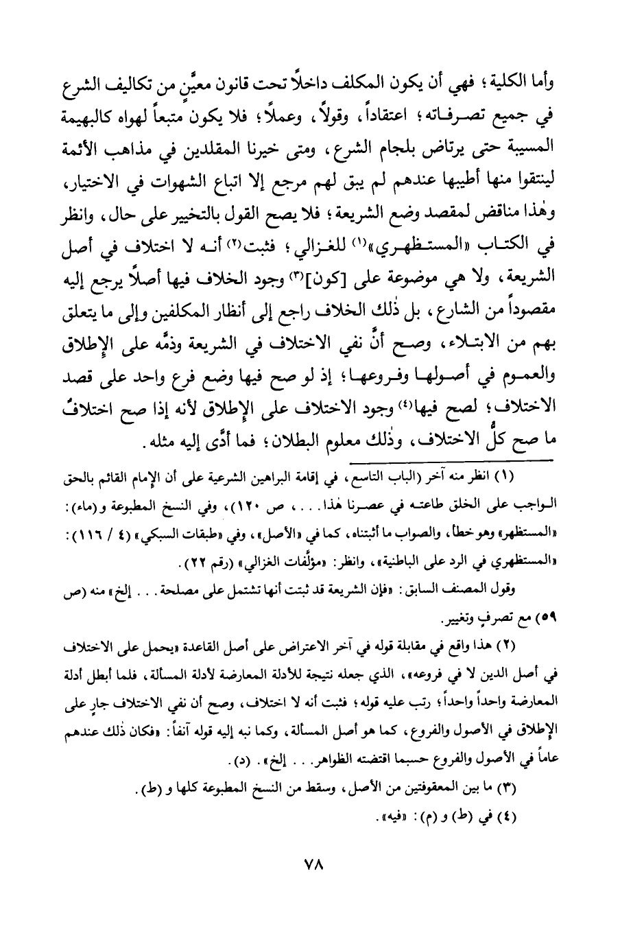 وَأَمَّا الْكُلِّيَّةُ؛ فَهِيَ أَنْ يَكُونَ الْمُكَلَّفُ دَاخِلًا تَحْتَ قَانُونٍ مُعَيَّنٍ مِنْ تَكَالِيفِ الشَّرْعِ فِي جَمِيعِ تَصَرُّفَاتِهِ؛ اعْتِقَادًا، وَقَوْلًا، وَعَمَلًا؛ فَلَا يَكُونُ مُتَّبِعًا لِهَوَاهُ كَالْبَهِيمَةِ الْمُسَيَّبَةِ حَتَّى يَرْتَاضَ بِلِجَامِ الشَّرْعِ، وَمَتَّى خَيَّرْنَا الْمُقَلِّدِينَ فِي مَذَاهِبِ الْأَئِمَّةِ؛ لِيَنْتَقُوا مِنْهَا أَطْيَبَهَا عِنْدَهُمْ لَمْ يبقَ لَهُمْ مَرْجِعٌ إِلَّا اتِّبَاعَ الشَّهَوَاتِ فِي الِاخْتِيَارِ، وَهَذَا مُنَاقِضٌ لِمَقْصِدِ وَضْعِ الشَّرِيعَةِ؛ فَلَا يَصِحُّ الْقَوْلُ بِالتَّخْيِيرِ عَلَى حَالٍ، وَانْظُرْ فِي الْكِتَابِ "الْمُسْتَظْهِرِيِّ" لِلْغَزَالِيِّ؛ فَثَبَتَ2 أَنَّهُ لَا اخْتِلَافَ فِي أَصْلِ الشَّرِيعَةِ، وَلَا هِيَ مَوْضُوعَةٌ عَلَى [كَوْنِ] 3 وُجُودِ الْخِلَافِ فِيهَا أَصْلًا يُرْجَعُ إِلَيْهِ مَقْصُودًا مِنَ الشَّارِعِ، بَلْ ذَلِكَ الْخِلَافُ رَاجِعٌ إِلَى أَنْظَارِ الْمُكَلَّفِينَ وَإِلَى مَا يَتَعَلَّقُ بِهِمْ مِنَ الِابْتِلَاءِ، وَصَحَّ أَنَّ نَفْيَ الِاخْتِلَافِ فِي الشَّرِيعَةِ وَذَمَّهُ عَلَى الْإِطْلَاقِ وَالْعُمُومِ فِي أُصُولِهَا وَفُرُوعِهَا؛ إِذْ لَوْ صَحَّ فِيهَا وَضْعُ فَرْعٍ وَاحِدٍ عَلَى قَصْدِ الِاخْتِلَافِ لَصَحَّ فِيهَا4 وُجُودُ الِاخْتِلَافِ عَلَى الْإِطْلَاقِ؛ لِأَنَّهُ إِذَا صَحَّ اخْتِلَافٌ مَا صَحَّ كُلُّ الِاخْتِلَافِ وَذَلِكَ مَعْلُومُ الْبُطْلَانِ؛ فَمَا أَدَّى إليه مثله.