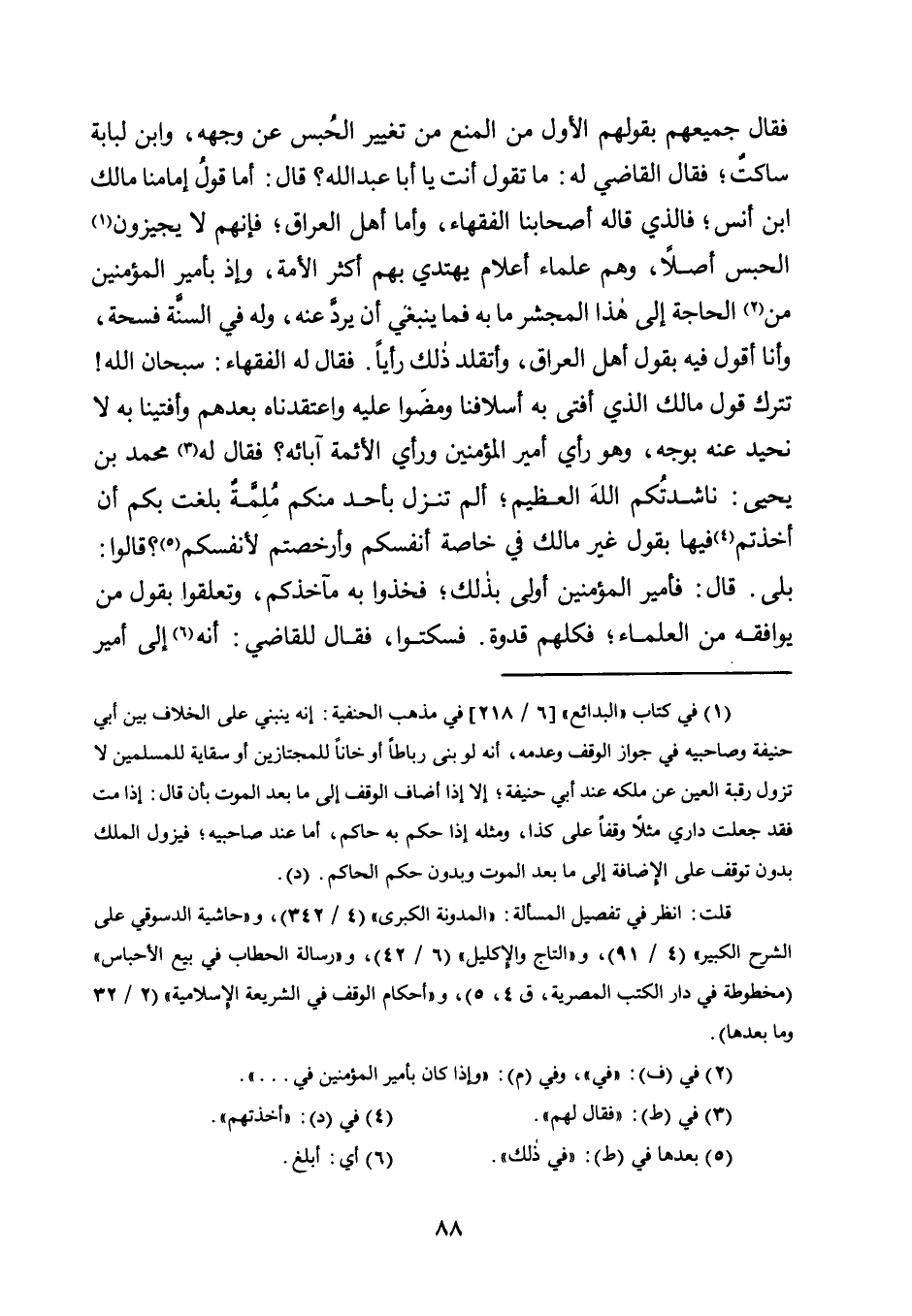 فَقَالَ جَمِيعُهُمْ بِقَوْلِهِمُ الْأَوَّلِ مِنَ الْمَنْعِ مِنْ تَغْيِيرِ الْحُبْسِ عَنْ وَجْهِهِ، وَابْنُ لُبَابَةَ سَاكِتٌ؛ فقال له القاضي: مَا تَقُولُ أَنْتَ يَا أَبَا عَبْدِ اللَّهِ؟ قَالَ: أَمَّا قَوْلُ إِمَامِنَا مَالِكِ بْنِ أَنَسٍ؛ فَالَّذِي قَالَهُ أَصْحَابُنَا الْفُقَهَاءُ، وَأَمَّا أَهْلُ الْعِرَاقِ؛ فَإِنَّهُمْ لَا يُجِيزُونَ1 الْحُبْسَ أَصْلًا، وَهُمْ عُلَمَاءُ أَعْلَامٌ يَهْتَدِي بِهِمْ أَكْثَرُ الْأُمَّةِ، وَإِذْ بِأَمِيرِ الْمُؤْمِنِينَ مِنَ2 الْحَاجَةِ إِلَى هَذَا الْمِجْشَرِ مَا بِهِ فَمَا يَنْبَغِي أَنْ يُرَدَّ عَنْهُ، وَلَهُ فِي السُّنَّةِ فُسْحَةٌ، وَأَنَا أَقُولُ فِيهِ بِقَوْلِ أَهْلِ الْعِرَاقِ، وَأَتَقَلَّدُ ذَلِكَ رَأْيًا، فَقَالَ لَهُ الْفُقَهَاءُ: سُبْحَانَ اللَّهِ! تَتْرُكُ قَوْلَ مَالِكٍ الَّذِي أَفْتَى بِهِ أَسْلَافُنَا وَمَضَوْا عَلَيْهِ وَاعْتَقَدْنَاهُ بَعْدَهُمْ وَأَفْتَيْنَا بِهِ لَا نَحِيدُ عَنْهُ بِوَجْهٍ، وَهُوَ رَأْيُ أَمِيرِ الْمُؤْمِنِينَ وَرَأْيُ الْأَئِمَّةِ آبَائِهِ؟ فَقَالَ لَهُ3 مُحَمَّدُ بْنُ يَحْيَى: نَاشَدْتُكُمُ اللَّهَ الْعَظِيمَ أَلَمْ تَنْزِلْ بِأَحَدٍ مِنْكُمْ مُلِمَّةٌ بَلَغَتْ بِكُمْ أن أخذتهم4 فِيهَا بِقَوْلِ غَيْرِ مَالِكٍ فِي خَاصَّةِ أَنْفُسِكُمْ وَأَرْخَصْتُمْ لِأَنْفُسِكُمْ؟ 5 قَالُوا: بَلَى. قَالَ: فَأَمِيرُ الْمُؤْمِنِينَ؛ أَوْلَى بِذَلِكَ فَخُذُوا بِهِ مَآخِذَكُمْ، وَتَعَلَّقُوا بِقَوْلِ مَنْ يُوَافِقُهُ مِنَ الْعُلَمَاءِ؛ فَكُلُّهُمْ قُدْوَةٌ. فَسَكَتُوا، فقال للقاضي: أنه6 إلى أمير