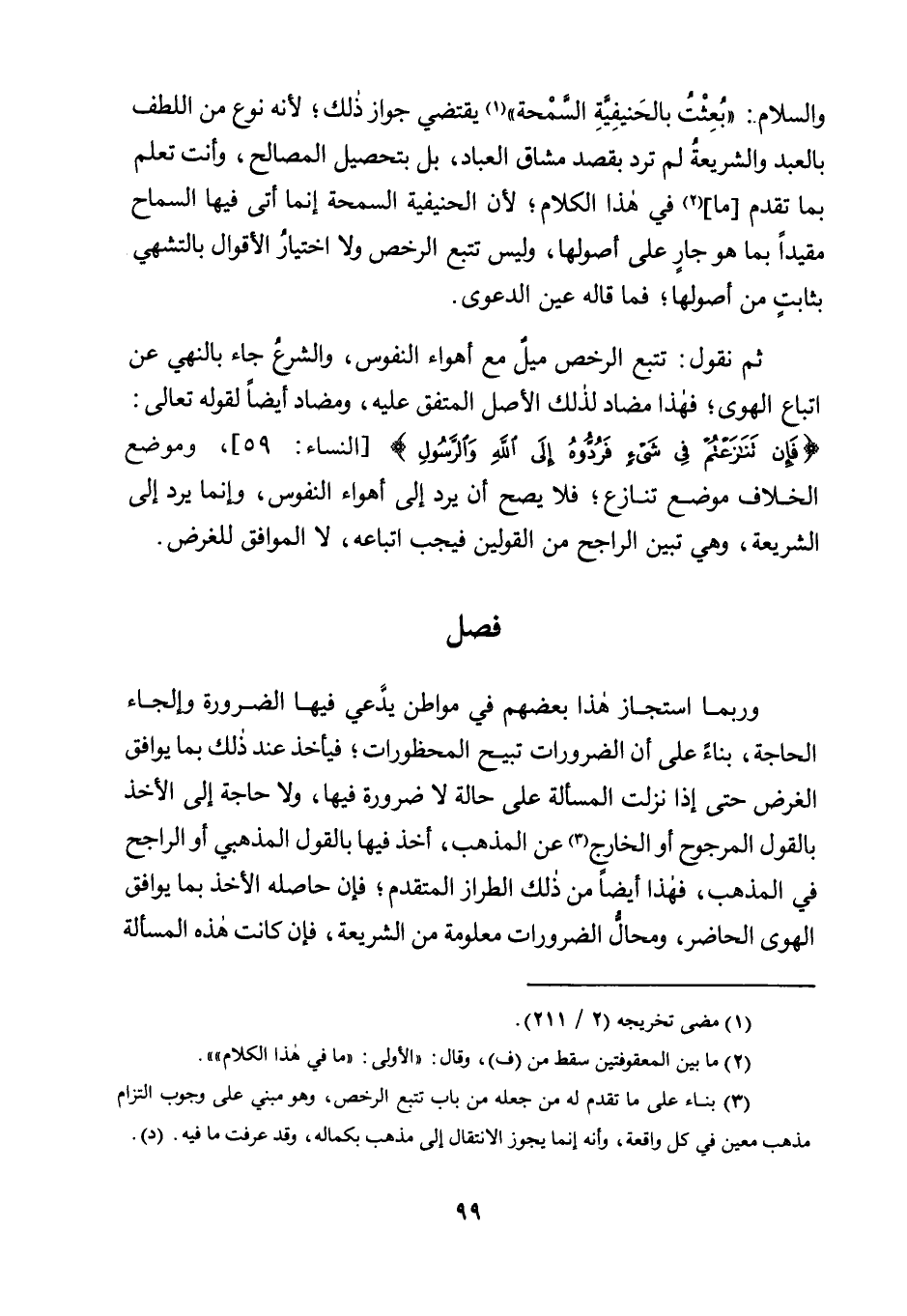 وَالسَّلَامُ: "بُعِْثتُ بالحَنيفِيَِّة السَّمْحة" 1 يَقْتَضِي جَوَازَ ذَلِكَ؛ لِأَنَّهُ نَوْعٌ مِنَ اللُّطْفِ بِالْعَبْدِ وَالشَّرِيعَةُ لَمْ تَرِدْ بِقَصْدِ مشاقِّ الْعِبَادِ، بَلْ بِتَحْصِيلِ الْمَصَالِحِ، وَأَنْتَ تَعْلَمُ بِمَا تَقَدَّمَ [مَا] 2 فِي هَذَا الْكَلَامِ؛ لِأَنَّ الْحَنِيفِيَّةَ السَّمْحَةَ إِنَّمَا أَتَى فِيهَا السَّمَاحُ مُقَيَّدًا بِمَا هُوَ جَارٍ عَلَى أُصُولِهَا، وَلَيْسَ تَتَبُّعُ الرُّخَصِ وَلَا اخْتِيَارُ الْأَقْوَالِ بِالتَّشَهِّي بِثَابِتٍ مِنْ أُصُولِهَا؛ فَمَا قَالَهُ عَيْنُ الدَّعْوَى.