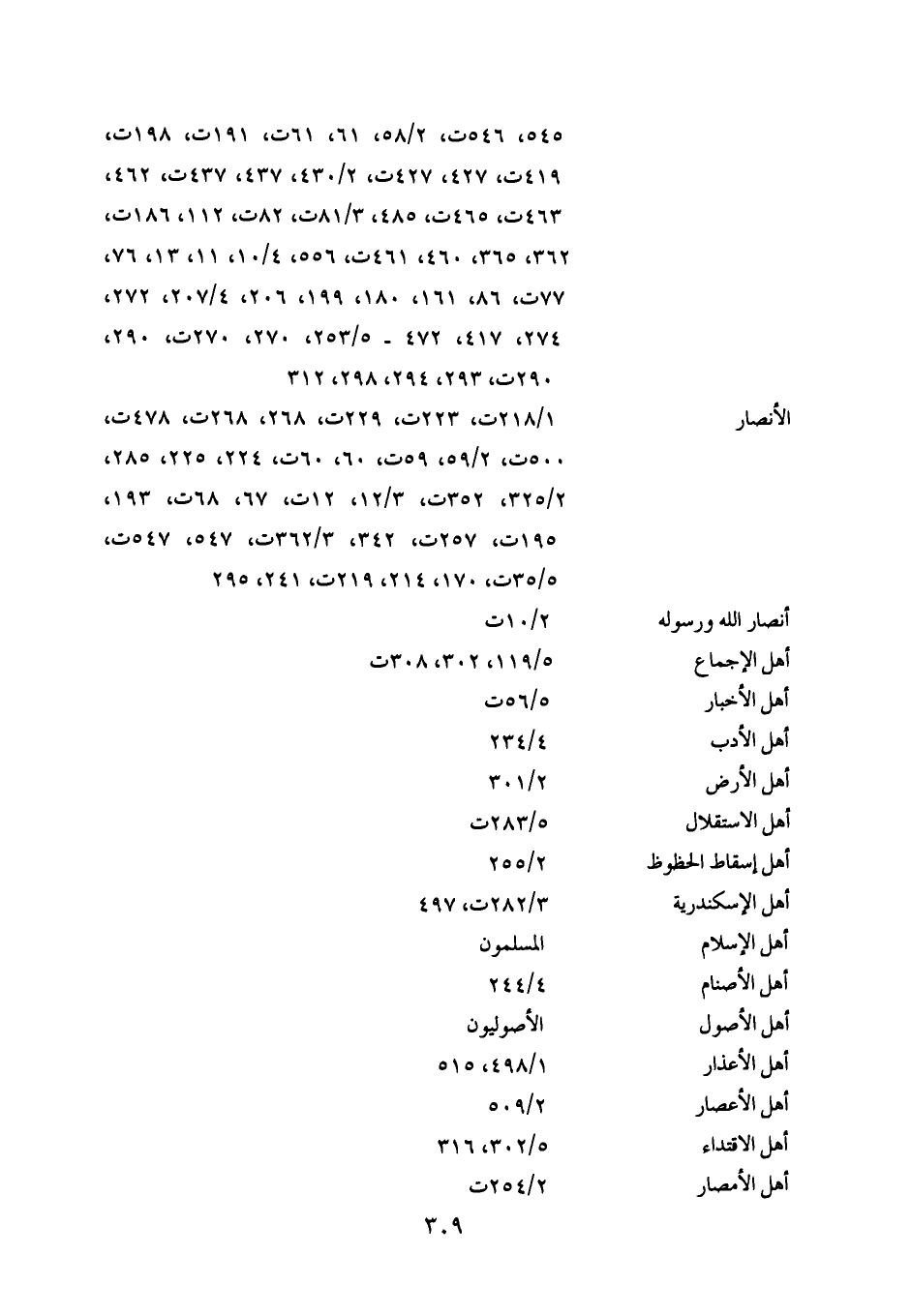 الأنصار 1/218ت، 223ت، 229ت، 268، 268ت، 478ت، 500ت، 2/59، 59ت، 60، 60ت، 224، 225، 285، 2/325، 352ت، 3/12، 12ت، 67، 68ت، 193، 195ت، 257ت، 342، 3/362ت، 547، 547ت، 5/35ت، 170، 214، 219ت، 241، 295