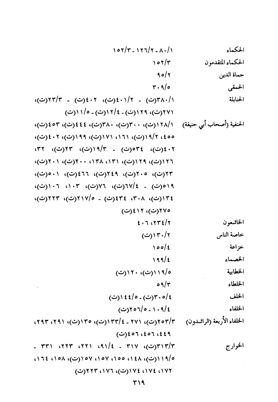 الحنفية "أصحاب أبي حنيفة" 1/128ت، 300ت، 380، 444ت، 453ت، 455، 2/19ت، 161، 171ت، 199ت، 402ت، 402ت، 534ت-3/19ت، 23ت، 32، 126ت، 129ت، 131، 138، 200ت، 201ت، 23ت، 205ت، 249ت، 466ت، 501ت، 519ت-4/678ت، 76ت، 103، 106ت، 134ت، 308، 434ت-5/217ت، 223ت، 275ت، 412ت