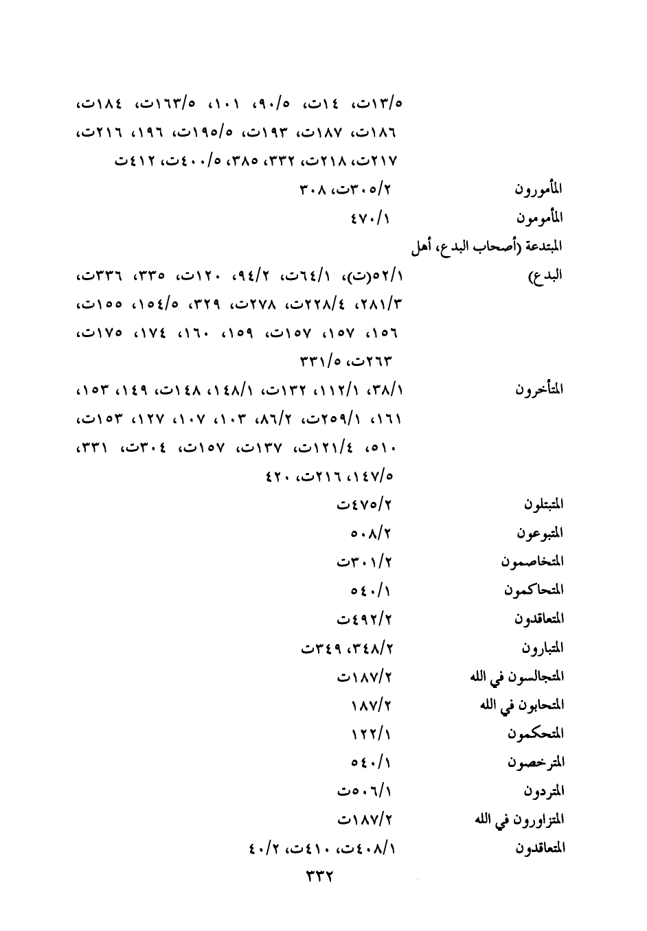 المبتدعة "أصحاب البدع، أهل البدع" 1/52ت، 1/64ت، 2/94، 120ت، 335، 336ت، 3/281، 4/228ت، 278ت، 329، 5/154، 155ت، 156، 157، 157ت، 159، 160، 174، 175ت، 263ت، 5/331